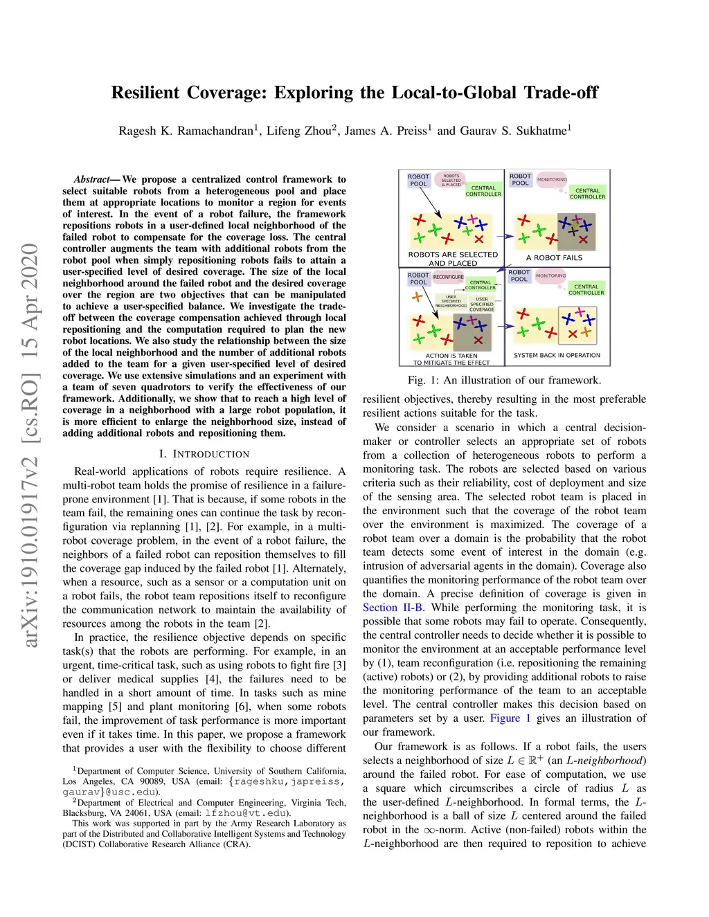 We propose a centralized control framework to select suitable robots from a heterogeneous pool and place them at appropriate locations to monitor a region for events of interest. In the event of a robot failure, the framework repositions robots in a user-defined local neighborhood of the failed robot to compensate for the coverage loss. The central controller augments the team with additional robots from the robot pool when simply repositioning robots fails to attain a user-specified level of desired coverage. The size of the local neighborhood around the failed robot and the desired coverage over the region are two objectives that can be manipulated to achieve a user-specified balance. We investigate the trade-off between the coverage compensation achieved through local repositioning and the computation required to plan the new robot locations. We also study the relationship between the size of the local neighborhood and the number of additional robots added to the team for a given user-specified level of desired coverage. We use extensive simulations and an experiment with a team of seven quadrotors to verify the effectiveness of our framework. Additionally, we show that to reach a high level of coverage in a neighborhood with a large robot population, it is more efficient to enlarge the neighborhood size, instead of adding additional robots and repositioning them.