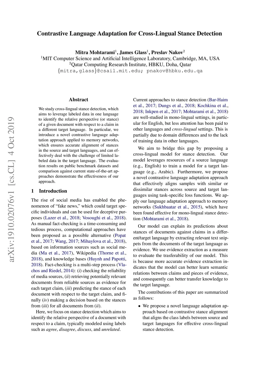 We study cross-lingual stance detection, which aims to leverage labeled data in one language to identify the relative perspective (or stance) of a given document with respect to a claim in a different target language. In particular, we introduce a novel contrastive language adaptation approach applied to memory networks, which ensures accurate alignment of stances in the source and target languages, and can effectively deal with the challenge of limited labeled data in the target language. The evaluation results on public benchmark datasets and comparison against current state-of-the-art approaches demonstrate the effectiveness of our approach.