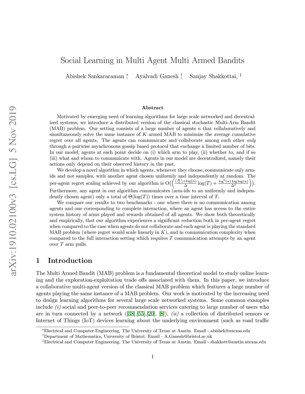 In this paper, we introduce a distributed version of the classical stochastic Multi-Arm Bandit (MAB) problem. Our setting consists of a large number of agents that collaboratively and simultaneously solve the same instance of armed MAB to minimize the average cumulative regret over all agents. The agents can communicate and collaborate among each other \emph{only} through a pairwise asynchronous gossip based protocol that exchange a limited number of bits. In our model, agents at each point decide on (i) which arm to play, (ii) whether to, and if so (iii) what and whom to communicate with. Agents in our model are decentralized, namely their actions only depend on their observed history in the past. We develop a novel algorithm in which agents, whenever they choose, communicate only arm-ids and not samples, with another agent chosen uniformly and independently at random. The per-agent regret scaling achieved by our algorithm is . Furthermore, any agent in our algorithm communicates only a total of times over a time interval of . We compare our results to two benchmarks - one where there is no communication among agents and one corresponding to complete interaction. We show both theoretically and empirically, that our algorithm experiences a significant reduction both in per-agent regret when compared to the case when agents do not collaborate and in communication complexity when compared to the full interaction setting which requires communication attempts by an agent over arm pulls.