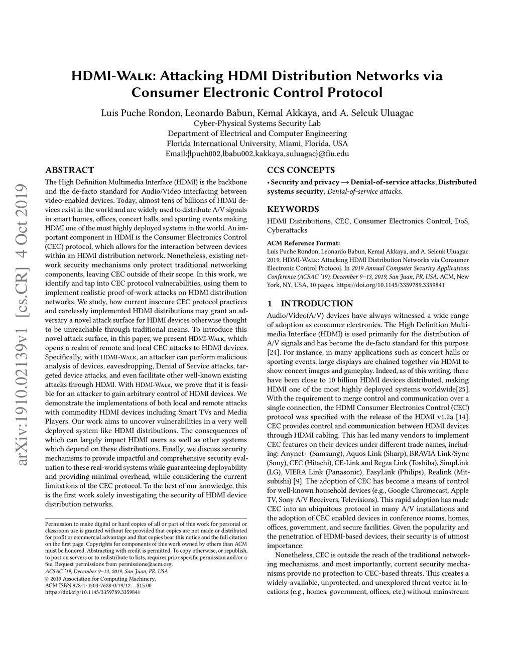 The High Definition Multimedia Interface (HDMI) is the de-facto standard for Audio/Video interfacing between video-enabled devices. Today, almost tens of billions of HDMI devices exist worldwide and are widely used to distribute A/V signals in smart homes, offices, concert halls, and sporting events making HDMI one of the most highly deployed systems in the world. An important component in HDMI is the Consumer Electronics Control (CEC) protocol, which allows for the interaction between devices within an HDMI distribution network. Nonetheless, existing network security mechanisms only protect traditional networking components, leaving CEC outside of their scope. In this work, we identify and tap into CEC protocol vulnerabilities, using them to implement realistic proof-of-work attacks on HDMI distribution networks. We study, how current insecure CEC protocol practices and HDMI distributions may grant an adversary a novel attack surface for HDMI devices otherwise thought to be unreachable. To introduce this novel attack surface, we present HDMI-Walk, which opens a realm of remote and local CEC attacks to HDMI devices. Specifically, with HDMI-Walk, an attacker can perform malicious analysis of devices, eavesdropping, Denial of Service attacks, targeted device attacks, and even facilitate well-known existing attacks through HDMI. With HDMI-Walk, we prove it is feasible for an attacker to gain arbitrary control of HDMI devices. We demonstrate the implementations of both local and remote attacks with commodity HDMI devices. Finally, we discuss security mechanisms to provide impactful and comprehensive security evaluation to these real-world systems while guaranteeing deployability and providing minimal overhead considering the current limitations of the CEC protocol. To the best of our knowledge, this is the first work solely investigating the security of HDMI device distribution networks.