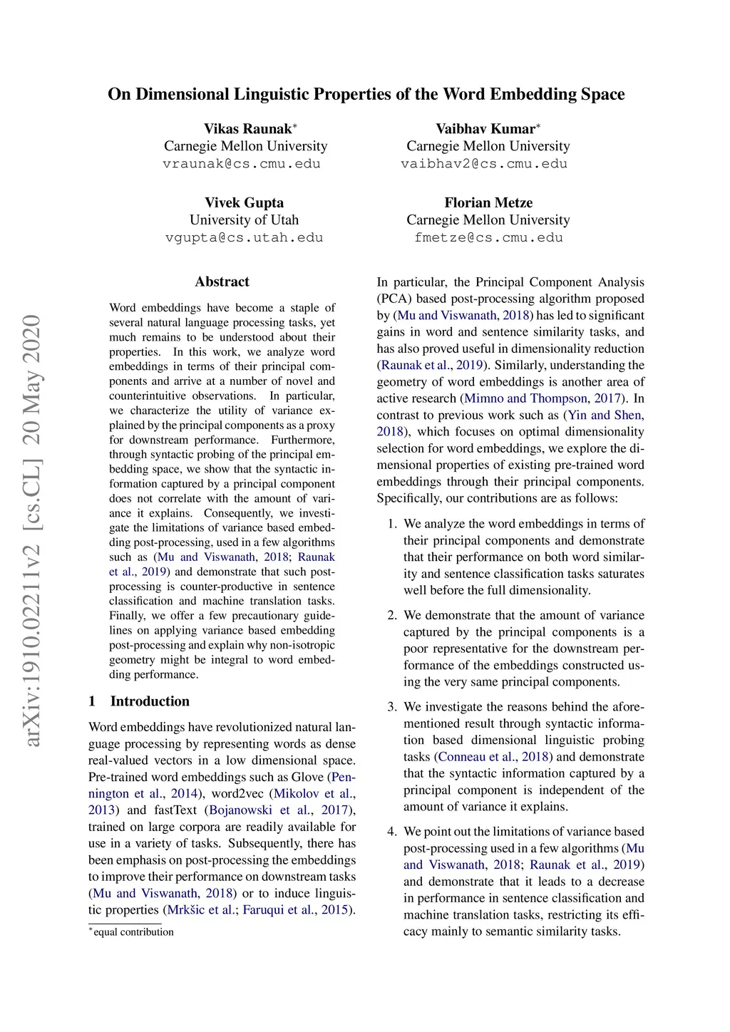 Word embeddings have become a staple of several natural language processing tasks, yet much remains to be understood about their properties. In this work, we analyze word embeddings in terms of their principal components and arrive at a number of novel and counterintuitive observations. In particular, we characterize the utility of variance explained by the principal components as a proxy for downstream performance. Furthermore, through syntactic probing of the principal embedding space, we show that the syntactic information captured by a principal component does not correlate with the amount of variance it explains. Consequently, we investigate the limitations of variance based embedding post-processing and demonstrate that such post-processing is counter-productive in sentence classification and machine translation tasks. Finally, we offer a few precautionary guidelines on applying variance based embedding post-processing and explain why non-isotropic geometry might be integral to word embedding performance.
