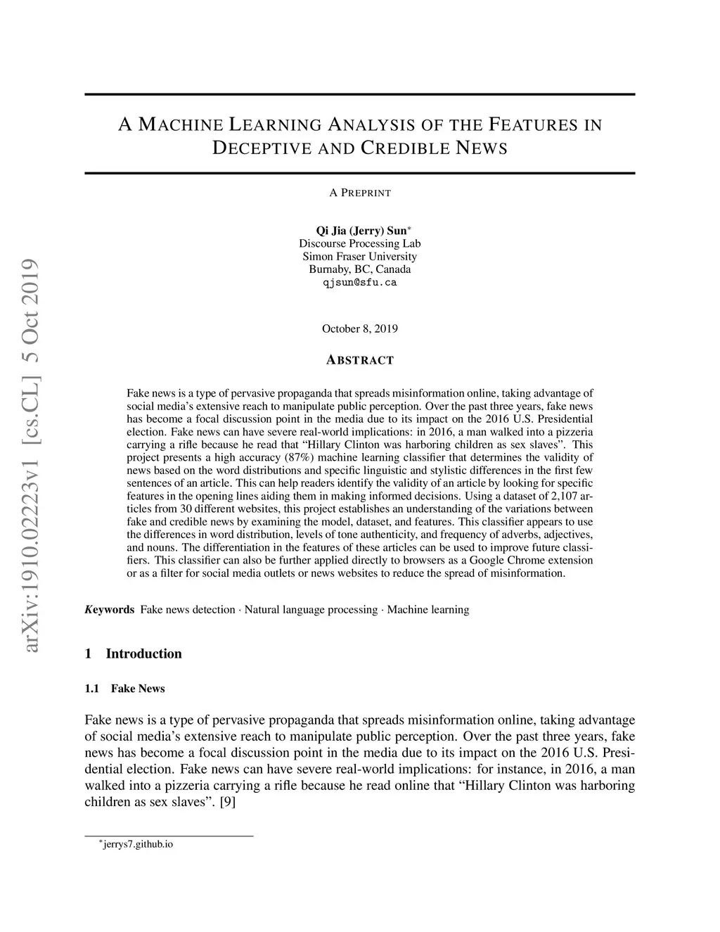 Fake news is a type of pervasive propaganda that spreads misinformation online, taking advantage of social media's extensive reach to manipulate public perception. Over the past three years, fake news has become a focal discussion point in the media due to its impact on the 2016 U.S. presidential election. Fake news can have severe real-world implications: in 2016, a man walked into a pizzeria carrying a rifle because he read that Hillary Clinton was harboring children as sex slaves. This project presents a high accuracy (87%) machine learning classifier that determines the validity of news based on the word distributions and specific linguistic and stylistic differences in the first few sentences of an article. This can help readers identify the validity of an article by looking for specific features in the opening lines aiding them in making informed decisions. Using a dataset of 2,107 articles from 30 different websites, this project establishes an understanding of the variations between fake and credible news by examining the model, dataset, and features. This classifier appears to use the differences in word distribution, levels of tone authenticity, and frequency of adverbs, adjectives, and nouns. The differentiation in the features of these articles can be used to improve future classifiers. This classifier can also be further applied directly to browsers as a Google Chrome extension or as a filter for social media outlets or news websites to reduce the spread of misinformation.