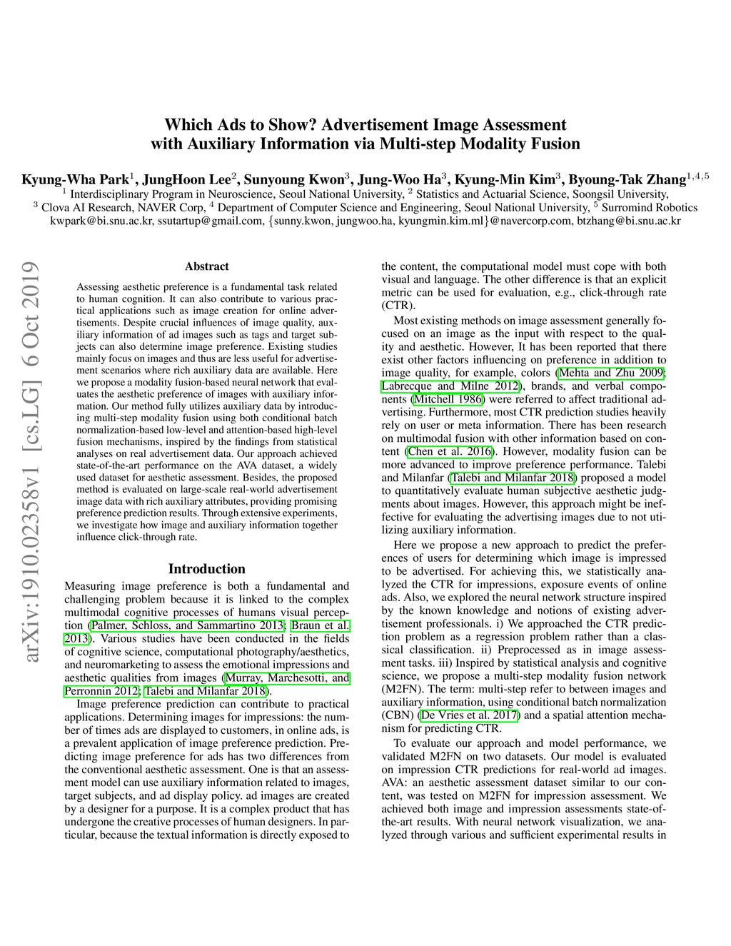 Assessing aesthetic preference is a fundamental task related to human cognition. It can also contribute to various practical applications such as image creation for online advertisements. Despite crucial influences of image quality, auxiliary information of ad images such as tags and target subjects can also determine image preference. Existing studies mainly focus on images and thus are less useful for advertisement scenarios where rich auxiliary data are available. Here we propose a modality fusion-based neural network that evaluates the aesthetic preference of images with auxiliary information. Our method fully utilizes auxiliary data by introducing multi-step modality fusion using both conditional batch normalization-based low-level and attention-based high-level fusion mechanisms, inspired by the findings from statistical analyses on real advertisement data. Our approach achieved state-of-the-art performance on the AVA dataset, a widely used dataset for aesthetic assessment. Besides, the proposed method is evaluated on large-scale real-world advertisement image data with rich auxiliary attributes, providing promising preference prediction results. Through extensive experiments, we investigate how image and auxiliary information together influence click-through rate.