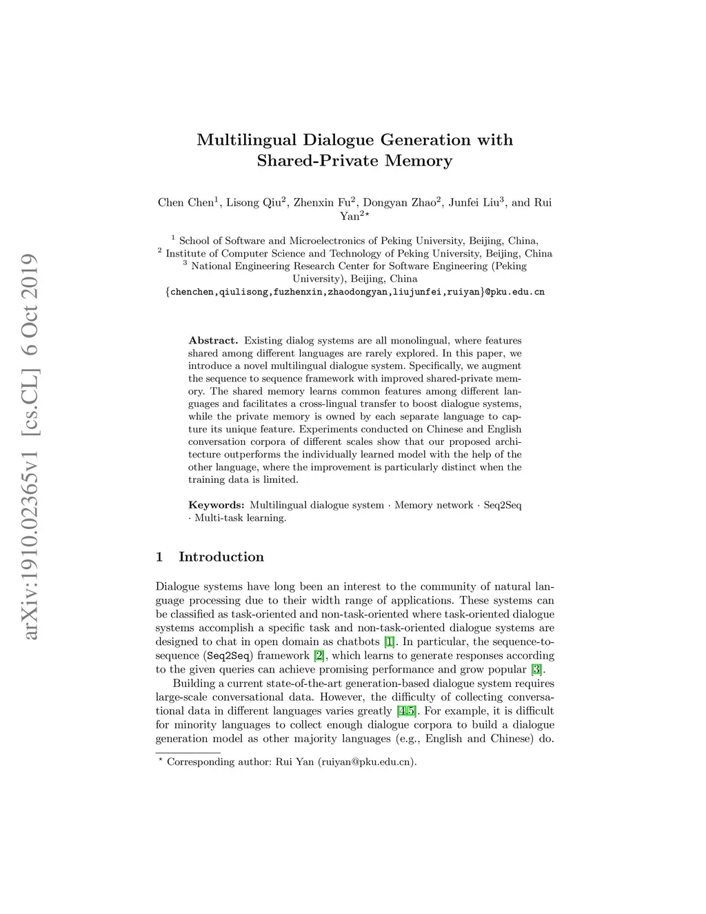 Existing dialog systems are all monolingual, where features shared among different languages are rarely explored. In this paper, we introduce a novel multilingual dialogue system. Specifically, we augment the sequence to sequence framework with improved shared-private memory. The shared memory learns common features among different languages and facilitates a cross-lingual transfer to boost dialogue systems, while the private memory is owned by each separate language to capture its unique feature. Experiments conducted on Chinese and English conversation corpora of different scales show that our proposed architecture outperforms the individually learned model with the help of the other language, where the improvement is particularly distinct when the training data is limited.