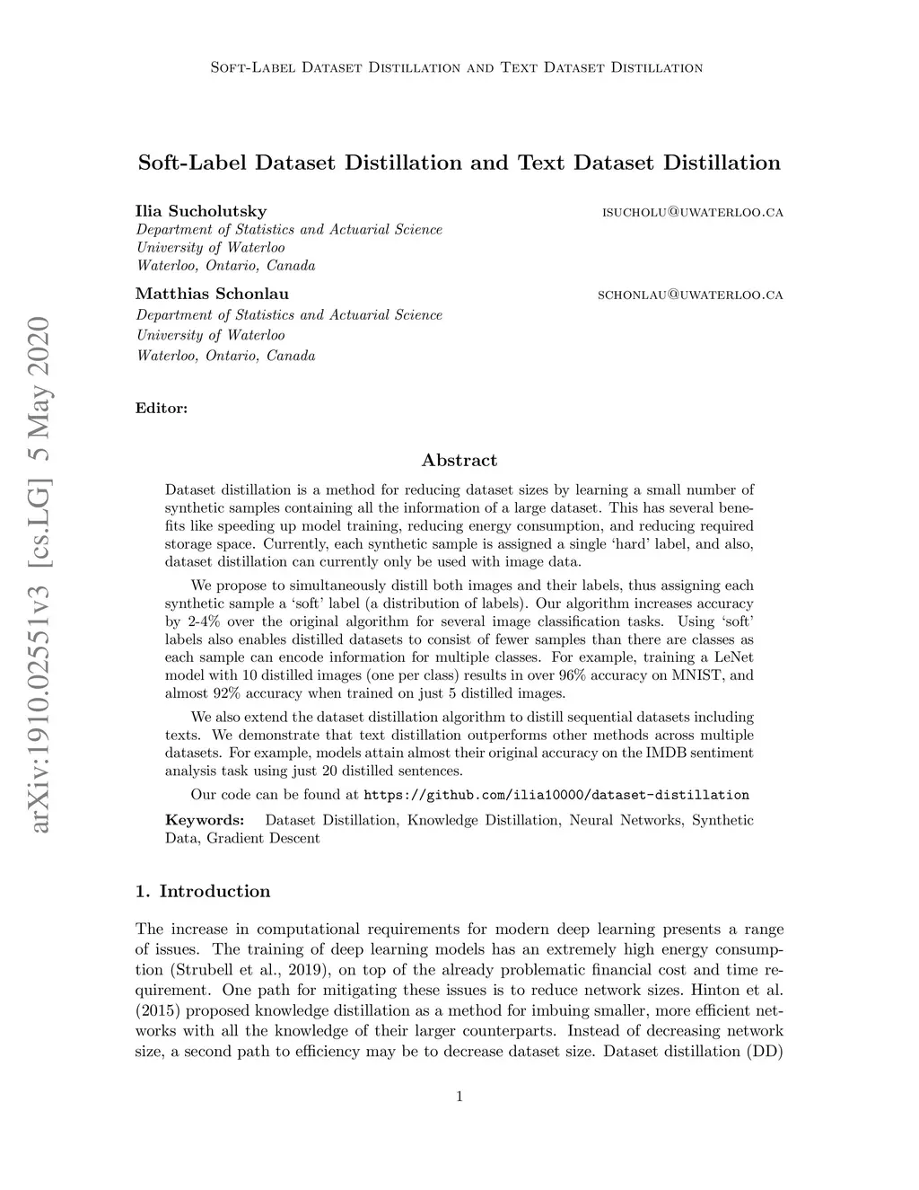 Dataset distillation is a method for reducing dataset sizes by learning a small number of synthetic samples containing all the information of a large dataset. This has several benefits like speeding up model training, reducing energy consumption, and reducing required storage space. Currently, each synthetic sample is assigned a single `hard' label, and also, dataset distillation can currently only be used with image data. We propose to simultaneously distill both images and their labels, thus assigning each synthetic sample a `soft' label (a distribution of labels). Our algorithm increases accuracy by 2-4% over the original algorithm for several image classification tasks. Using `soft' labels also enables distilled datasets to consist of fewer samples than there are classes as each sample can encode information for multiple classes. For example, training a LeNet model with 10 distilled images (one per class) results in over 96% accuracy on MNIST, and almost 92% accuracy when trained on just 5 distilled images. We also extend the dataset distillation algorithm to distill sequential datasets including texts. We demonstrate that text distillation outperforms other methods across multiple datasets. For example, models attain almost their original accuracy on the IMDB sentiment analysis task using just 20 distilled sentences. Our code can be found at .