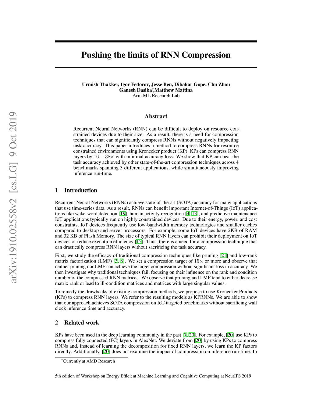 Recurrent Neural Networks (RNN) can be difficult to deploy on resource constrained devices due to their size. As a result, there is a need for compression techniques that can significantly compress RNNs without negatively impacting task accuracy. This paper introduces a method to compress RNNs for resource constrained environments using Kronecker product (KP). KPs can compress RNN layers by 16-38x with minimal accuracy loss. We show that KP can beat the task accuracy achieved by other state-of-the-art compression techniques (pruning and low-rank matrix factorization) across 4 benchmarks spanning 3 different applications, while simultaneously improving inference run-time.