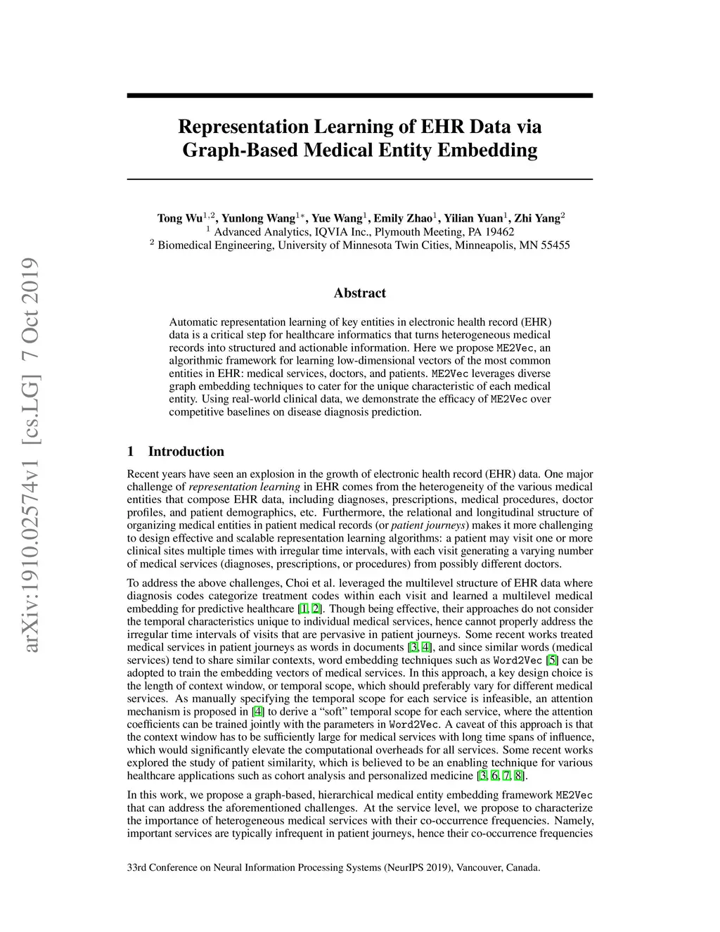 Automatic representation learning of key entities in electronic health record (EHR) data is a critical step for healthcare informatics that turns heterogeneous medical records into structured and actionable information. Here we propose ME2Vec, an algorithmic framework for learning low-dimensional vectors of the most common entities in EHR: medical services, doctors, and patients. ME2Vec leverages diverse graph embedding techniques to cater for the unique characteristic of each medical entity. Using real-world clinical data, we demonstrate the efficacy of ME2Vec over competitive baselines on disease diagnosis prediction.