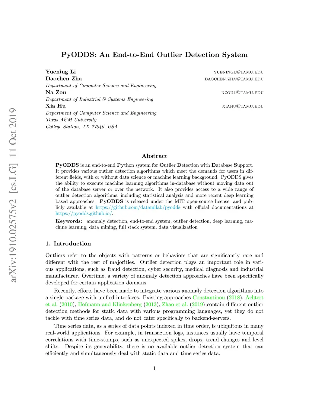 PyODDS is an end-to end Python system for outlier detection with database support. PyODDS provides outlier detection algorithms which meet the demands for users in different fields, w/wo data science or machine learning background. PyODDS gives the ability to execute machine learning algorithms in-database without moving data out of the database server or over the network. It also provides access to a wide range of outlier detection algorithms, including statistical analysis and more recent deep learning based approaches. PyODDS is released under the MIT open-source license, and currently available at (https://github.com/datamllab/pyodds) with official documentations at (https://pyodds.github.io/).