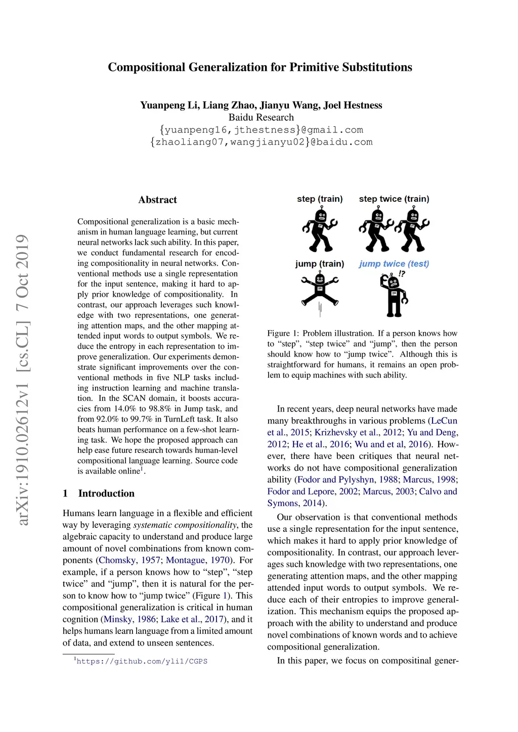 Compositional generalization is a basic mechanism in human language learning, but current neural networks lack such ability. In this paper, we conduct fundamental research for encoding compositionality in neural networks. Conventional methods use a single representation for the input sentence, making it hard to apply prior knowledge of compositionality. In contrast, our approach leverages such knowledge with two representations, one generating attention maps, and the other mapping attended input words to output symbols. We reduce the entropy in each representation to improve generalization. Our experiments demonstrate significant improvements over the conventional methods in five NLP tasks including instruction learning and machine translation. In the SCAN domain, it boosts accuracies from 14.0% to 98.8% in Jump task, and from 92.0% to 99.7% in TurnLeft task. It also beats human performance on a few-shot learning task. We hope the proposed approach can help ease future research towards human-level compositional language learning.