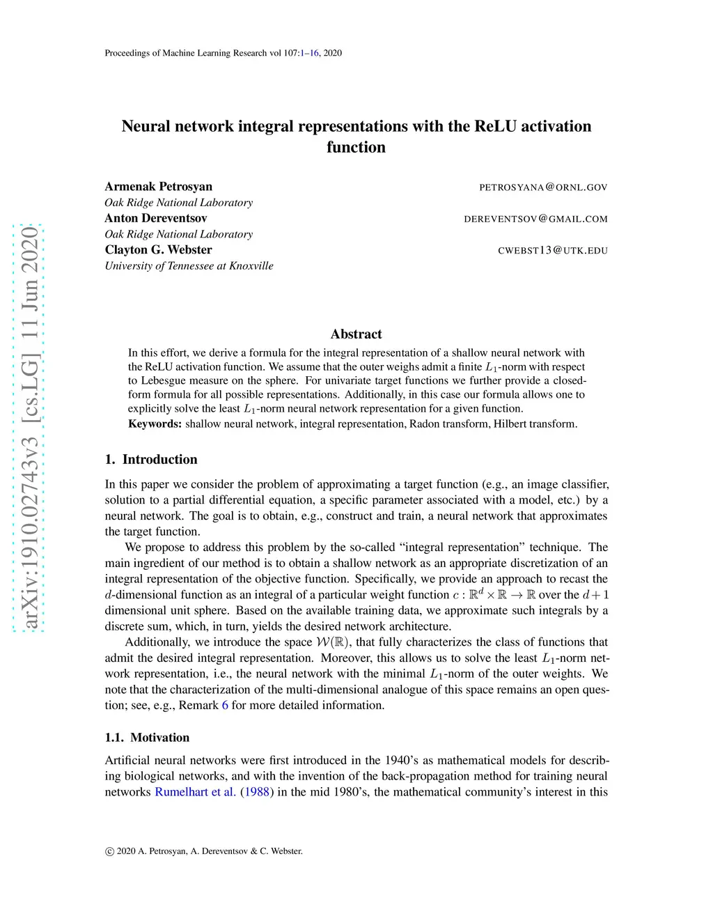 In this effort, we derive a formula for the integral representation of a shallow neural network with the ReLU activation function. We assume that the outer weighs admit a finite -norm with respect to Lebesgue measure on the sphere. For univariate target functions we further provide a closed-form formula for all possible representations. Additionally, in this case our formula allows one to explicitly solve the least -norm neural network representation for a given function.