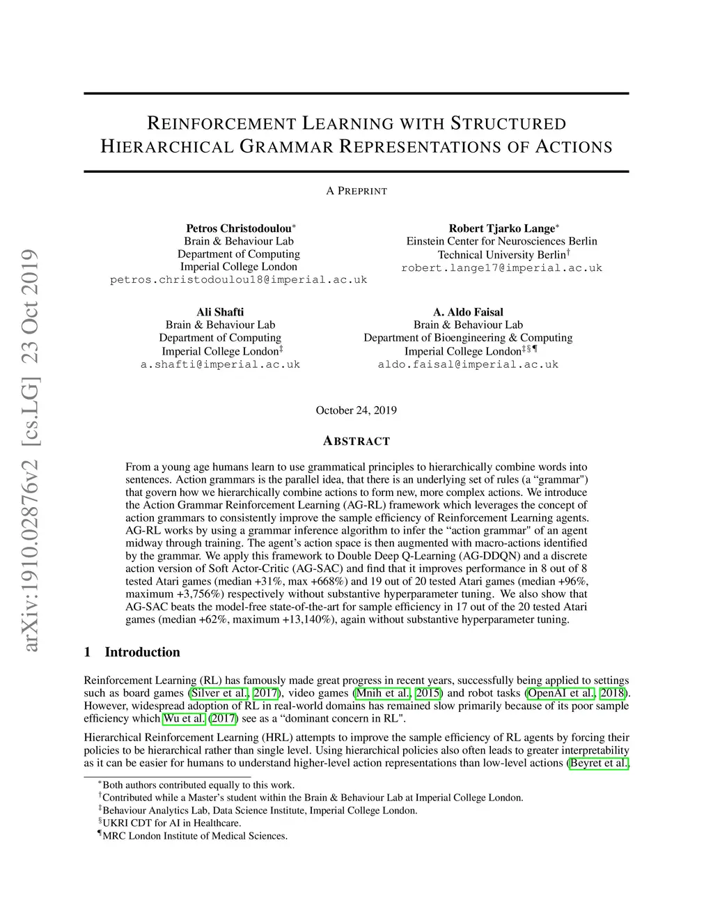 From a young age humans learn to use grammatical principles to hierarchically combine words into sentences. Action grammars is the parallel idea, that there is an underlying set of rules (a "grammar") that govern how we hierarchically combine actions to form new, more complex actions. We introduce the Action Grammar Reinforcement Learning (AG-RL) framework which leverages the concept of action grammars to consistently improve the sample efficiency of Reinforcement Learning agents. AG-RL works by using a grammar inference algorithm to infer the "action grammar" of an agent midway through training. The agent's action space is then augmented with macro-actions identified by the grammar. We apply this framework to Double Deep Q-Learning (AG-DDQN) and a discrete action version of Soft Actor-Critic (AG-SAC) and find that it improves performance in 8 out of 8 tested Atari games (median +31%, max +668%) and 19 out of 20 tested Atari games (median +96%, maximum +3,756%) respectively without substantive hyperparameter tuning. We also show that AG-SAC beats the model-free state-of-the-art for sample efficiency in 17 out of the 20 tested Atari games (median +62%, maximum +13,140%), again without substantive hyperparameter tuning.