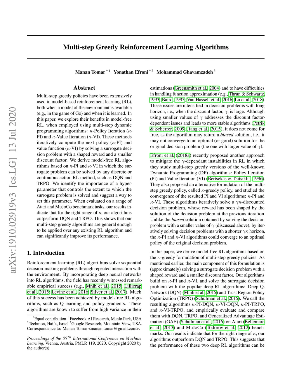 Multi-step greedy policies have been extensively used in model-based reinforcement learning (RL), both when a model of the environment is available (e.g.,~in the game of Go) and when it is learned. In this paper, we explore their benefits in model-free RL, when employed using multi-step dynamic programming algorithms: -Policy Iteration (-PI) and -Value Iteration (-VI). These methods iteratively compute the next policy (-PI) and value function (-VI) by solving a surrogate decision problem with a shaped reward and a smaller discount factor. We derive model-free RL algorithms based on -PI and -VI in which the surrogate problem can be solved by any discrete or continuous action RL method, such as DQN and TRPO. We identify the importance of a hyper-parameter that controls the extent to which the surrogate problem is solved and suggest a way to set this parameter. When evaluated on a range of Atari and MuJoCo benchmark tasks, our results indicate that for the right range of , our algorithms outperform DQN and TRPO. This shows that our multi-step greedy algorithms are general enough to be applied over any existing RL algorithm and can significantly improve its performance.