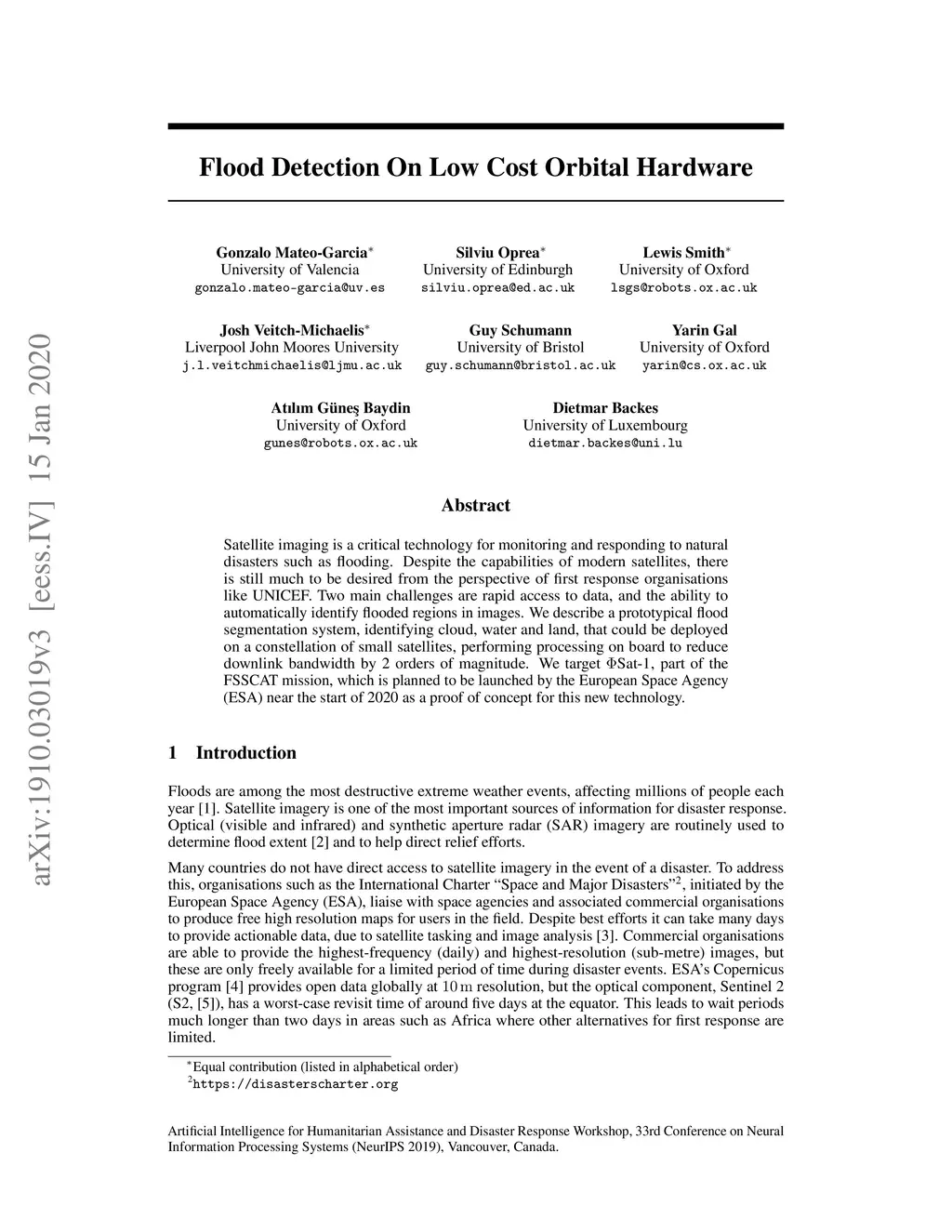 Satellite imaging is a critical technology for monitoring and responding to natural disasters such as flooding. Despite the capabilities of modern satellites, there is still much to be desired from the perspective of first response organisations like UNICEF. Two main challenges are rapid access to data, and the ability to automatically identify flooded regions in images. We describe a prototypical flood segmentation system, identifying cloud, water and land, that could be deployed on a constellation of small satellites, performing processing on board to reduce downlink bandwidth by 2 orders of magnitude. We target PhiSat-1, part of the FSSCAT mission, which is planned to be launched by the European Space Agency (ESA) near the start of 2020 as a proof of concept for this new technology.