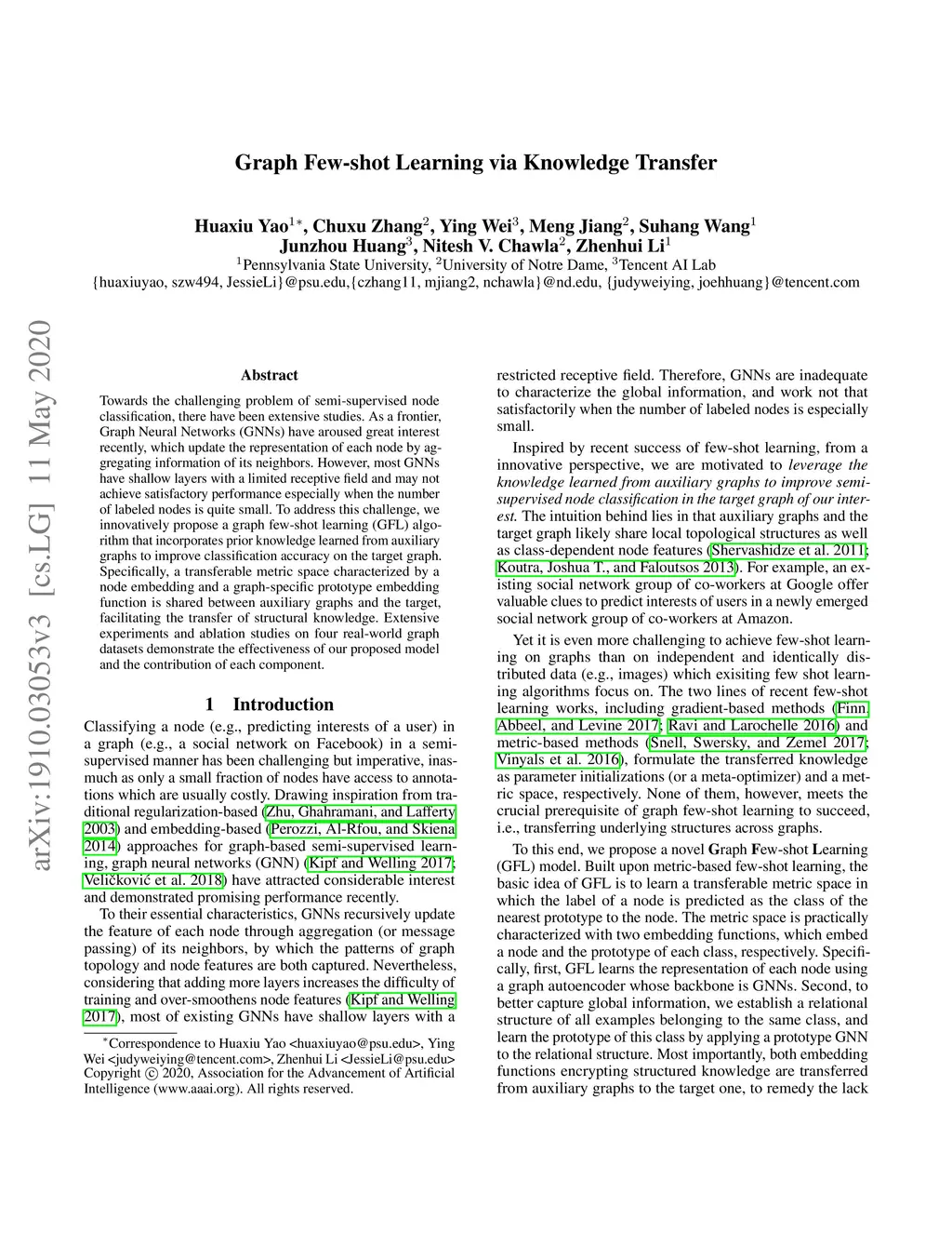 Towards the challenging problem of semi-supervised node classification, there have been extensive studies. As a frontier, Graph Neural Networks (GNNs) have aroused great interest recently, which update the representation of each node by aggregating information of its neighbors. However, most GNNs have shallow layers with a limited receptive field and may not achieve satisfactory performance especially when the number of labeled nodes is quite small. To address this challenge, we innovatively propose a graph few-shot learning (GFL) algorithm that incorporates prior knowledge learned from auxiliary graphs to improve classification accuracy on the target graph. Specifically, a transferable metric space characterized by a node embedding and a graph-specific prototype embedding function is shared between auxiliary graphs and the target, facilitating the transfer of structural knowledge. Extensive experiments and ablation studies on four real-world graph datasets demonstrate the effectiveness of our proposed model.
