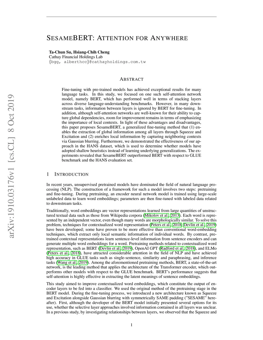 SesameBERT: Attention for Anywhere