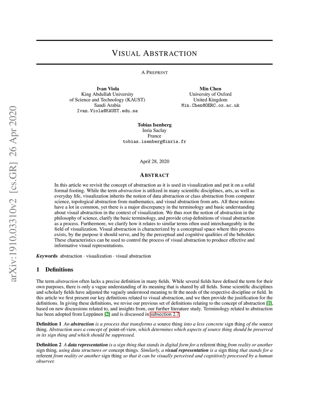 In this article we revisit the concept of abstraction as it is used in visualization and put it on a solid formal footing. While the term \emph{abstraction} is utilized in many scientific disciplines, arts, as well as everyday life, visualization inherits the notion of data abstraction or class abstraction from computer science, topological abstraction from mathematics, and visual abstraction from arts. All these notions have a lot in common, yet there is a major discrepancy in the terminology and basic understanding about visual abstraction in the context of visualization. We thus root the notion of abstraction in the philosophy of science, clarify the basic terminology, and provide crisp definitions of visual abstraction as a process. Furthermore, we clarify how it relates to similar terms often used interchangeably in the field of visualization. Visual abstraction is characterized by a conceptual space where this process exists, by the purpose it should serve, and by the perceptual and cognitive qualities of the beholder. These characteristics can be used to control the process of visual abstraction to produce effective and informative visual representations.