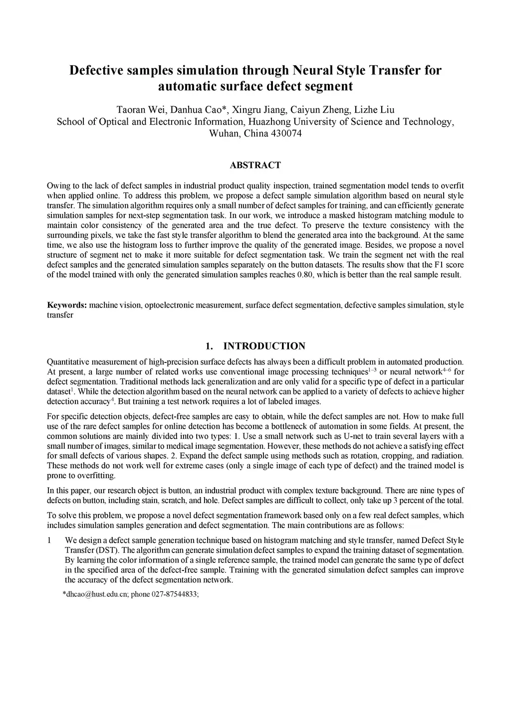 Owing to the lack of defect samples in industrial product quality inspection, trained segmentation model tends to overfit when applied online. To address this problem, we propose a defect sample simulation algorithm based on neural style transfer. The simulation algorithm requires only a small number of defect samples for training, and can efficiently generate simulation samples for next-step segmentation task. In our work, we introduce a masked histogram matching module to maintain color consistency of the generated area and the true defect. To preserve the texture consistency with the surrounding pixels, we take the fast style transfer algorithm to blend the generated area into the background. At the same time, we also use the histogram loss to further improve the quality of the generated image. Besides, we propose a novel structure of segment net to make it more suitable for defect segmentation task. We train the segment net with the real defect samples and the generated simulation samples separately on the button datasets. The results show that the F1 score of the model trained with only the generated simulation samples reaches 0.80, which is better than the real sample result.