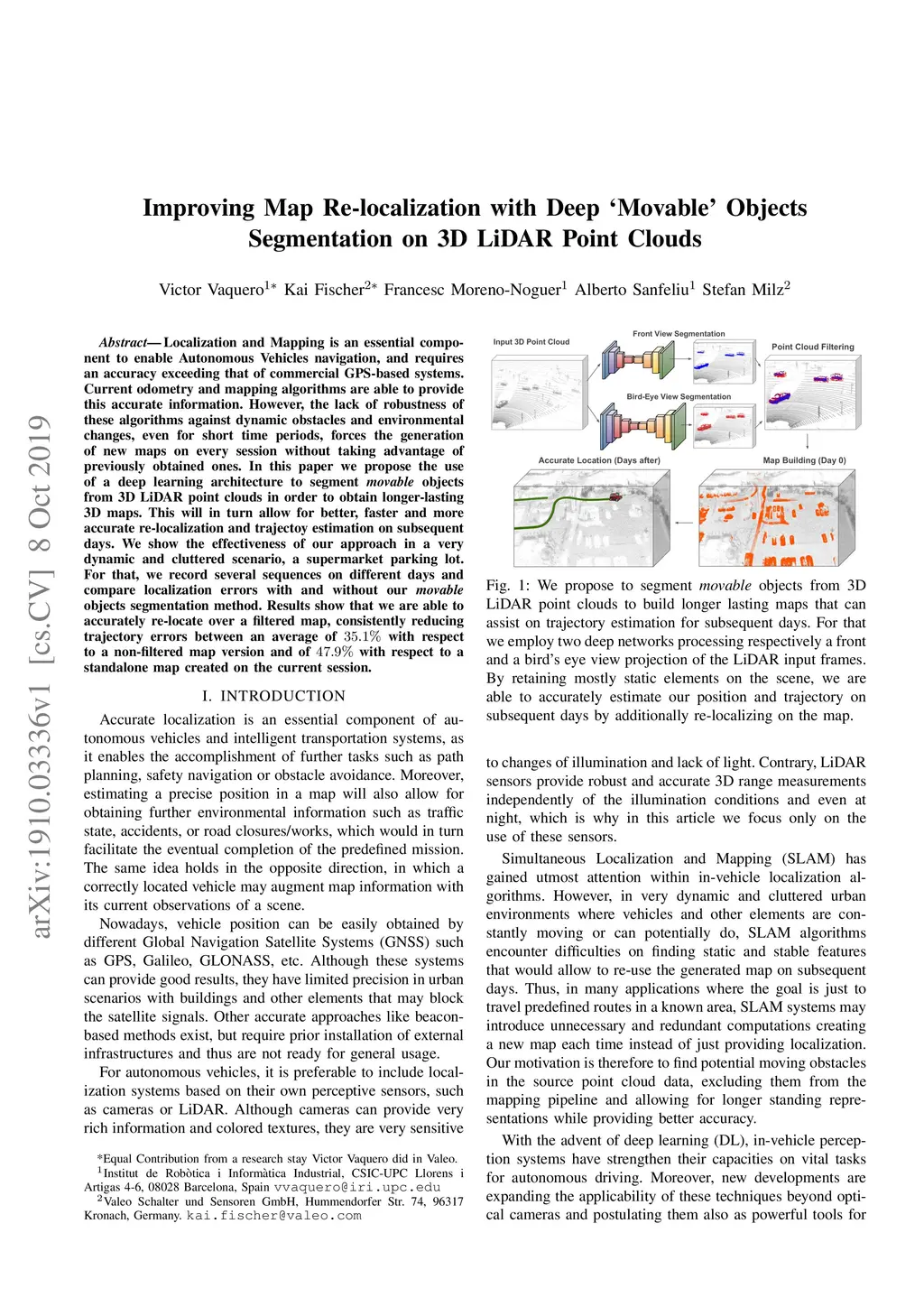 Localization and Mapping is an essential component to enable Autonomous Vehicles navigation, and requires an accuracy exceeding that of commercial GPS-based systems. Current odometry and mapping algorithms are able to provide this accurate information. However, the lack of robustness of these algorithms against dynamic obstacles and environmental changes, even for short time periods, forces the generation of new maps on every session without taking advantage of previously obtained ones. In this paper we propose the use of a deep learning architecture to segment movable objects from 3D LiDAR point clouds in order to obtain longer-lasting 3D maps. This will in turn allow for better, faster and more accurate re-localization and trajectoy estimation on subsequent days. We show the effectiveness of our approach in a very dynamic and cluttered scenario, a supermarket parking lot. For that, we record several sequences on different days and compare localization errors with and without our movable objects segmentation method. Results show that we are able to accurately re-locate over a filtered map, consistently reducing trajectory errors between an average of 35.1% with respect to a non-filtered map version and of 47.9% with respect to a standalone map created on the current session.