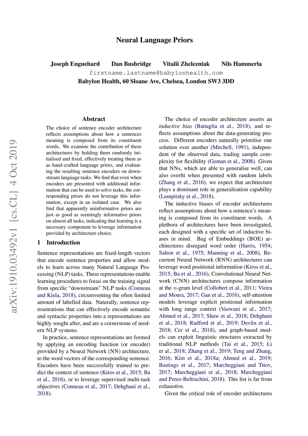 The choice of sentence encoder architecture reflects assumptions about how a sentence's meaning is composed from its constituent words. We examine the contribution of these architectures by holding them randomly initialised and fixed, effectively treating them as as hand-crafted language priors, and evaluating the resulting sentence encoders on downstream language tasks. We find that even when encoders are presented with additional information that can be used to solve tasks, the corresponding priors do not leverage this information, except in an isolated case. We also find that apparently uninformative priors are just as good as seemingly informative priors on almost all tasks, indicating that learning is a necessary component to leverage information provided by architecture choice.