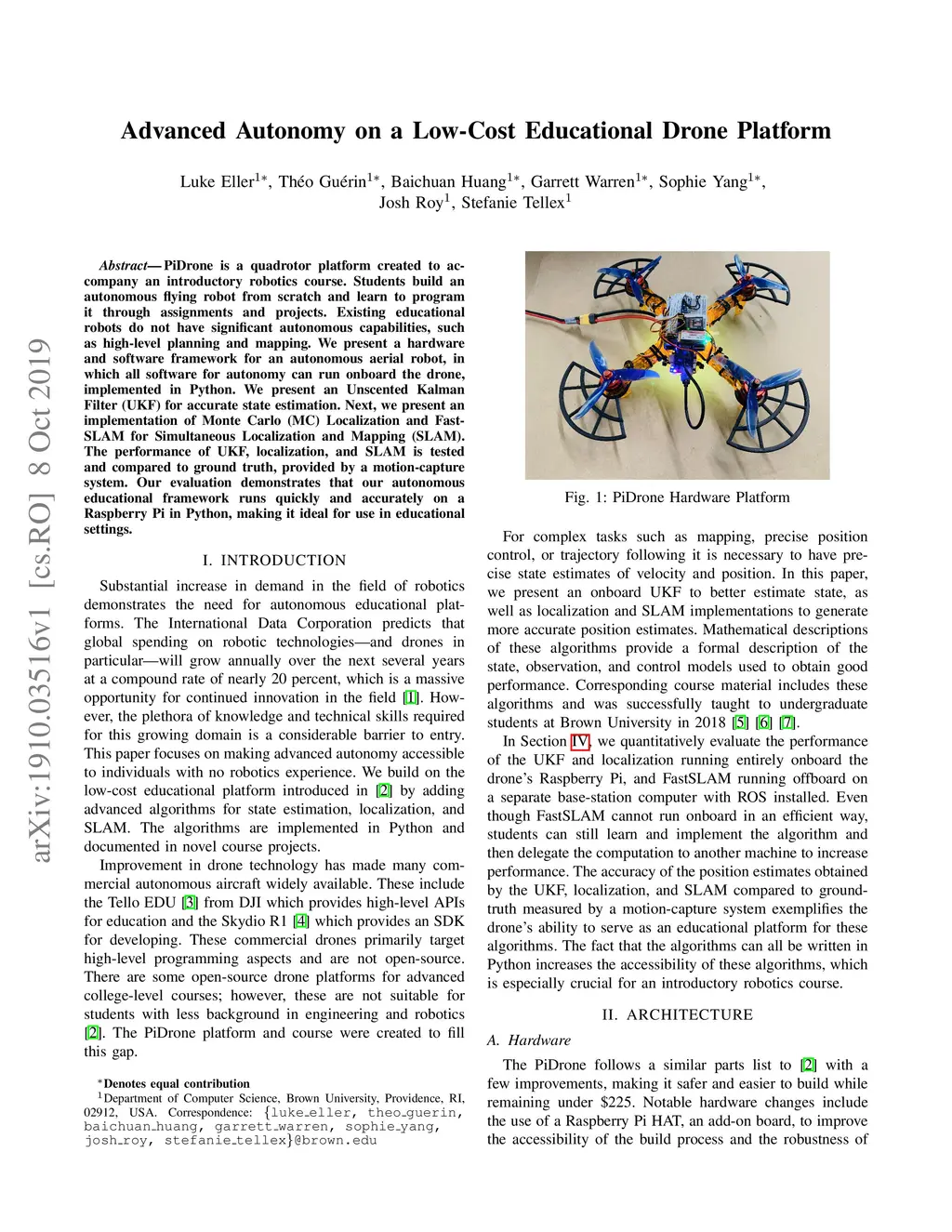 PiDrone is a quadrotor platform created to accompany an introductory robotics course. Students build an autonomous flying robot from scratch and learn to program it through assignments and projects. Existing educational robots do not have significant autonomous capabilities, such as high-level planning and mapping. We present a hardware and software framework for an autonomous aerial robot, in which all software for autonomy can run onboard the drone, implemented in Python. We present an Unscented Kalman Filter (UKF) for accurate state estimation. Next, we present an implementation of Monte Carlo (MC) Localization and FastSLAM for Simultaneous Localization and Mapping (SLAM). The performance of UKF, localization, and SLAM is tested and compared to ground truth, provided by a motion-capture system. Our evaluation demonstrates that our autonomous educational framework runs quickly and accurately on a Raspberry Pi in Python, making it ideal for use in educational settings.