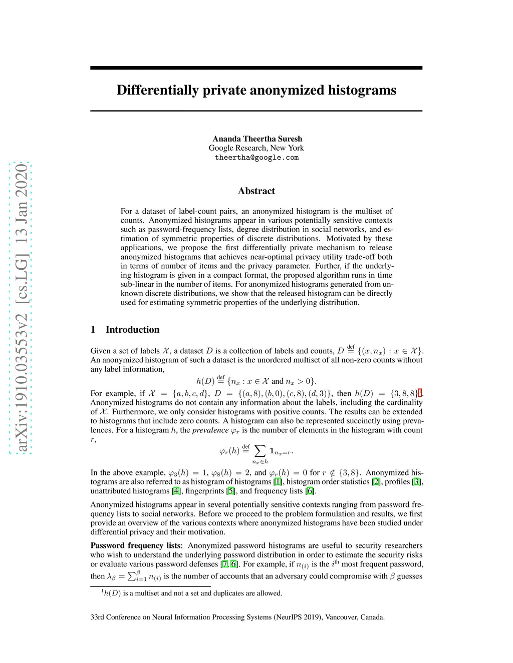 For a dataset of label-count pairs, an anonymized histogram is the multiset of counts. Anonymized histograms appear in various potentially sensitive contexts such as password-frequency lists, degree distribution in social networks, and estimation of symmetric properties of discrete distributions. Motivated by these applications, we propose the first differentially private mechanism to release anonymized histograms that achieves near-optimal privacy utility trade-off both in terms of number of items and the privacy parameter. Further, if the underlying histogram is given in a compact format, the proposed algorithm runs in time sub-linear in the number of items. For anonymized histograms generated from unknown discrete distributions, we show that the released histogram can be directly used for estimating symmetric properties of the underlying distribution.