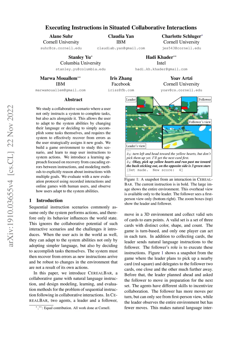 We study a collaborative scenario where a user not only instructs a system to complete tasks, but also acts alongside it. This allows the user to adapt to the system abilities by changing their language or deciding to simply accomplish some tasks themselves, and requires the system to effectively recover from errors as the user strategically assigns it new goals. We build a game environment to study this scenario, and learn to map user instructions to system actions. We introduce a learning approach focused on recovery from cascading errors between instructions, and modeling methods to explicitly reason about instructions with multiple goals. We evaluate with a new evaluation protocol using recorded interactions and online games with human users, and observe how users adapt to the system abilities.