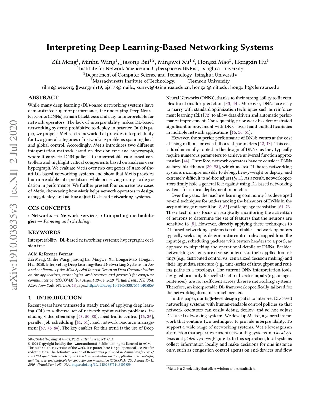 While many deep learning (DL)-based networking systems have demonstrated superior performance, the underlying Deep Neural Networks (DNNs) remain blackboxes and stay uninterpretable for network operators. The lack of interpretability makes DL-based networking systems prohibitive to deploy in practice. In this paper, we propose Metis, a framework that provides interpretability for two general categories of networking problems spanning local and global control. Accordingly, Metis introduces two different interpretation methods based on decision tree and hypergraph, where it converts DNN policies to interpretable rule-based controllers and highlight critical components based on analysis over hypergraph. We evaluate Metis over several state-of-the-art DL-based networking systems and show that Metis provides human-readable interpretations while preserving nearly no degradation in performance. We further present four concrete use cases of Metis, showcasing how Metis helps network operators to design, debug, deploy, and ad-hoc adjust DL-based networking systems.