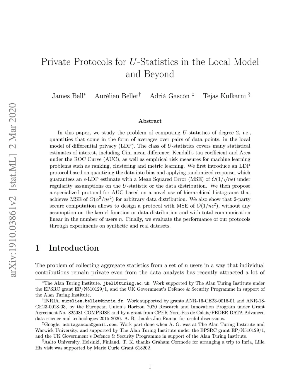 In this paper, we study the problem of computing -statistics of degree , i.e., quantities that come in the form of averages over pairs of data points, in the local model of differential privacy (LDP). The class of -statistics covers many statistical estimates of interest, including Gini mean difference, Kendall's tau coefficient and Area under the ROC Curve (AUC), as well as empirical risk measures for machine learning problems such as ranking, clustering and metric learning. We first introduce an LDP protocol based on quantizing the data into bins and applying randomized response, which guarantees an -LDP estimate with a Mean Squared Error (MSE) of under regularity assumptions on the -statistic or the data distribution. We then propose a specialized protocol for AUC based on a novel use of hierarchical histograms that achieves MSE of for arbitrary data distribution. We also show that 2-party secure computation allows to design a protocol with MSE of , without any assumption on the kernel function or data distribution and with total communication linear in the number of users . Finally, we evaluate the performance of our protocols through experiments on synthetic and real datasets.
