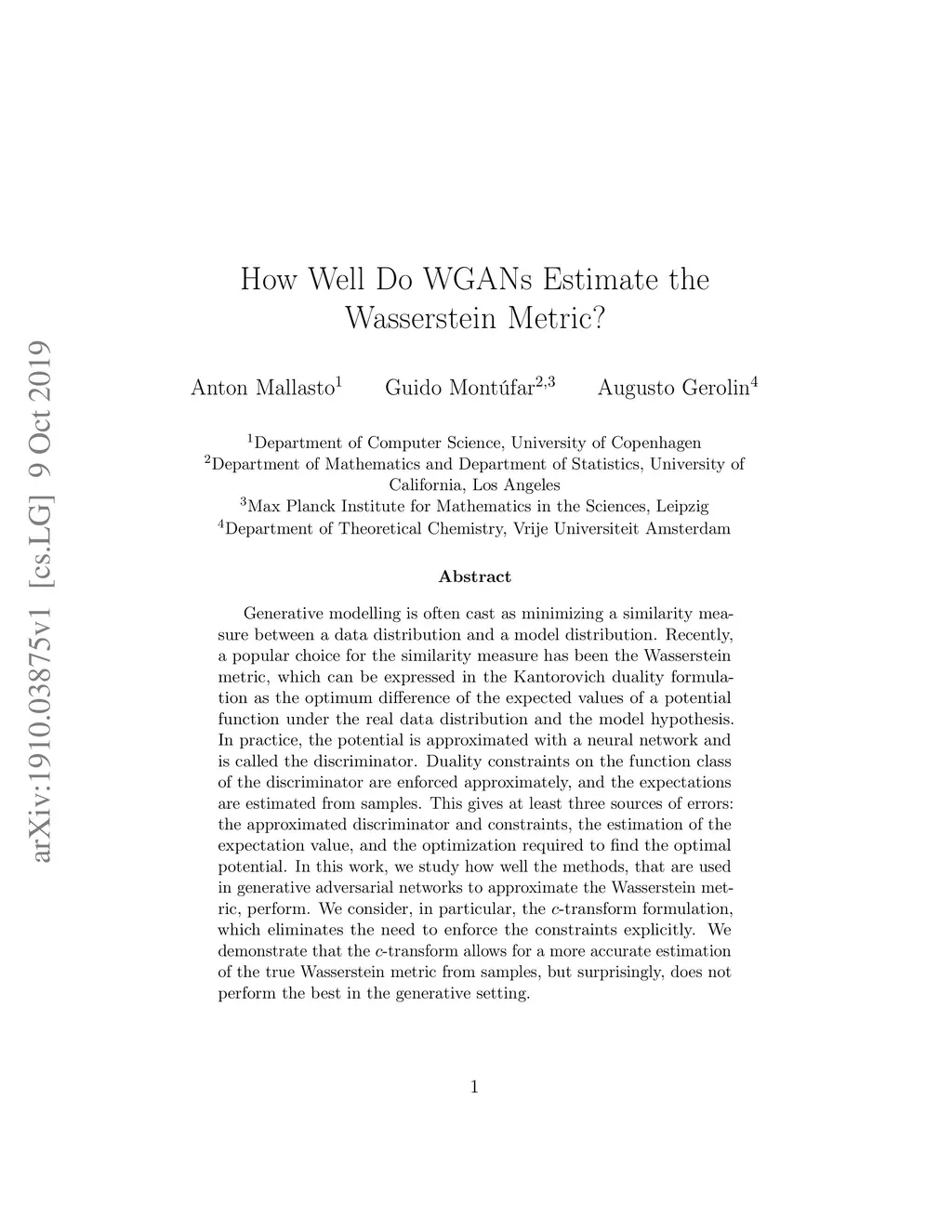 Generative modelling is often cast as minimizing a similarity measure between a data distribution and a model distribution. Recently, a popular choice for the similarity measure has been the Wasserstein metric, which can be expressed in the Kantorovich duality formulation as the optimum difference of the expected values of a potential function under the real data distribution and the model hypothesis. In practice, the potential is approximated with a neural network and is called the discriminator. Duality constraints on the function class of the discriminator are enforced approximately, and the expectations are estimated from samples. This gives at least three sources of errors: the approximated discriminator and constraints, the estimation of the expectation value, and the optimization required to find the optimal potential. In this work, we study how well the methods, that are used in generative adversarial networks to approximate the Wasserstein metric, perform. We consider, in particular, the -transform formulation, which eliminates the need to enforce the constraints explicitly. We demonstrate that the -transform allows for a more accurate estimation of the true Wasserstein metric from samples, but surprisingly, does not perform the best in the generative setting.
