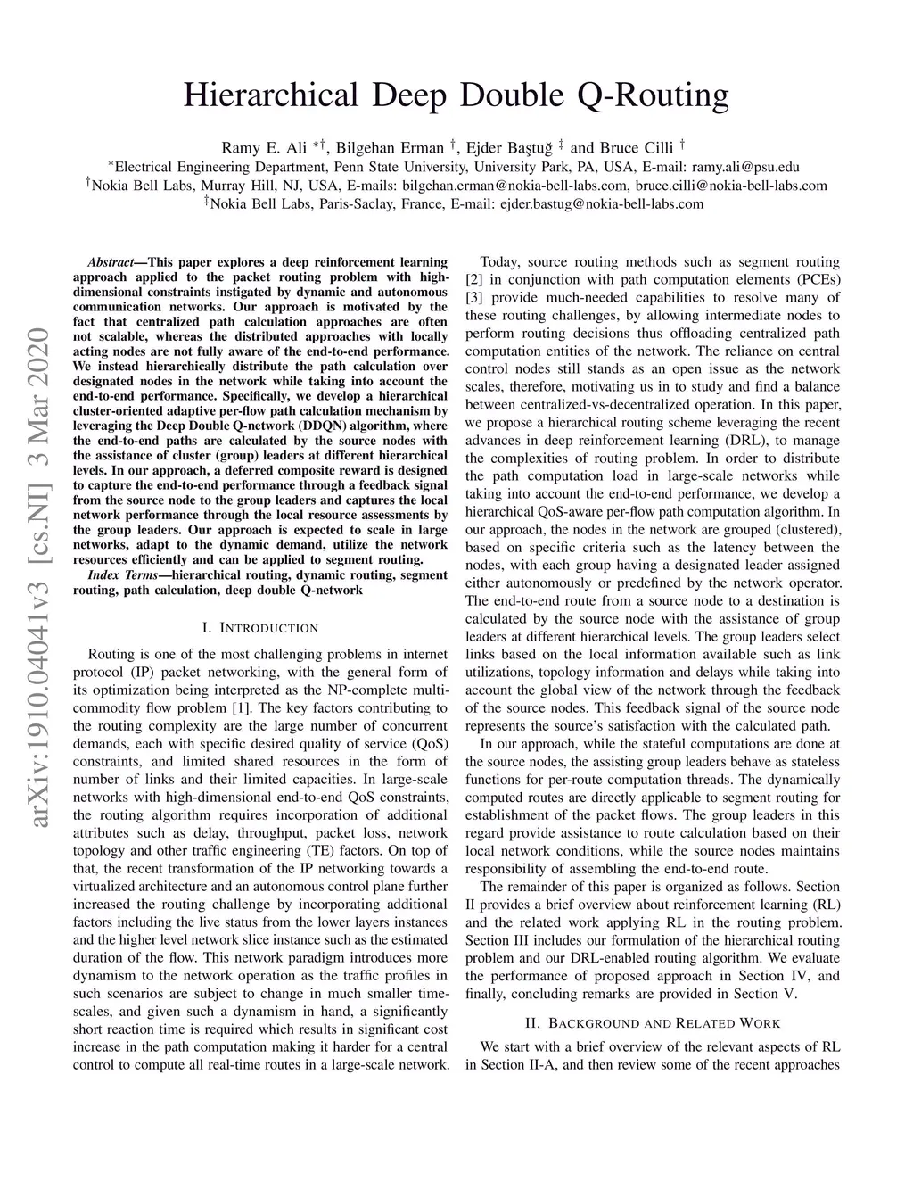 This paper explores a deep reinforcement learning approach applied to the packet routing problem with high-dimensional constraints instigated by dynamic and autonomous communication networks. Our approach is motivated by the fact that centralized path calculation approaches are often not scalable, whereas the distributed approaches with locally acting nodes are not fully aware of the end-to-end performance. We instead hierarchically distribute the path calculation over designated nodes in the network while taking into account the end-to-end performance. Specifically, we develop a hierarchical cluster-oriented adaptive per-flow path calculation mechanism by leveraging the Deep Double Q-network (DDQN) algorithm, where the end-to-end paths are calculated by the source nodes with the assistance of cluster (group) leaders at different hierarchical levels. In our approach, a deferred composite reward is designed to capture the end-to-end performance through a feedback signal from the source nodes to the group leaders and captures the local network performance through the local resource assessments by the group leaders. This approach scales in large networks, adapts to the dynamic demand, utilizes the network resources efficiently and can be applied to segment routing.