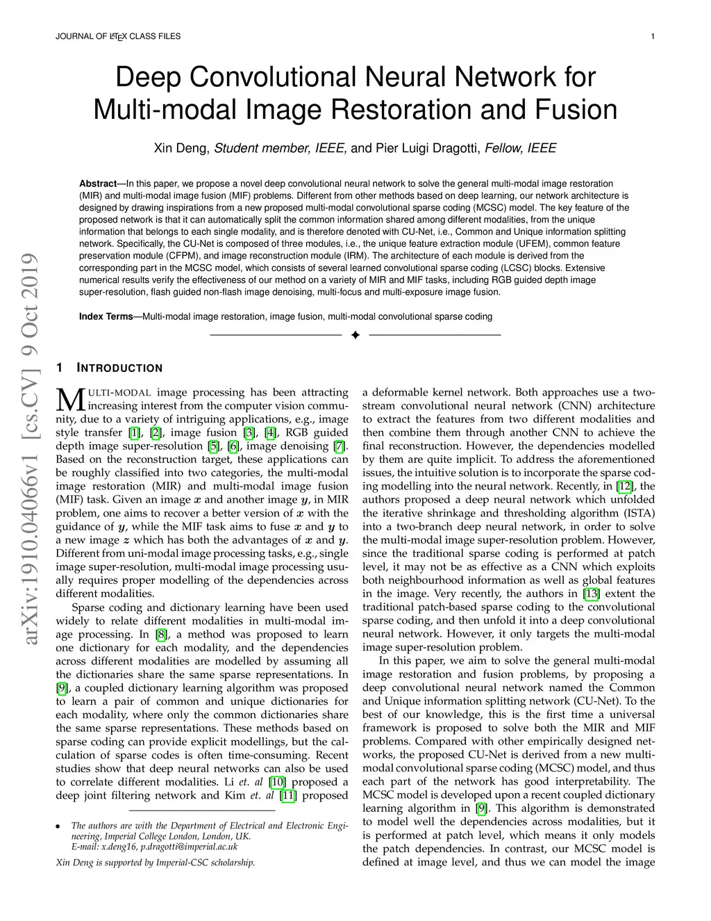 Deep Convolutional Neural Network for Multi-modal Image Restoration and