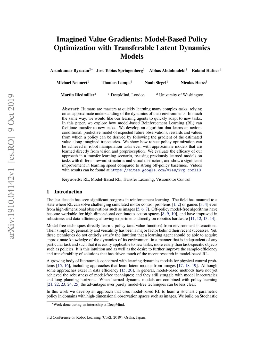 Humans are masters at quickly learning many complex tasks, relying on an approximate understanding of the dynamics of their environments. In much the same way, we would like our learning agents to quickly adapt to new tasks. In this paper, we explore how model-based Reinforcement Learning (RL) can facilitate transfer to new tasks. We develop an algorithm that learns an action-conditional, predictive model of expected future observations, rewards and values from which a policy can be derived by following the gradient of the estimated value along imagined trajectories. We show how robust policy optimization can be achieved in robot manipulation tasks even with approximate models that are learned directly from vision and proprioception. We evaluate the efficacy of our approach in a transfer learning scenario, re-using previously learned models on tasks with different reward structures and visual distractors, and show a significant improvement in learning speed compared to strong off-policy baselines. Videos with results can be found at https://sites.google.com/view/ivg-corl19