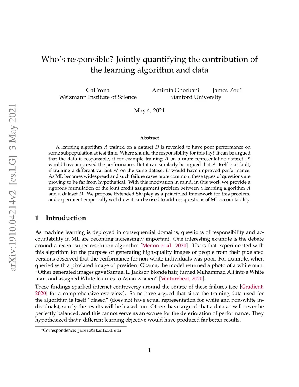 A fancy learning algorithm outperforms a baseline method when they are both trained on the same data. Should get all of the credit for the improved performance or does the training data also deserve some credit? When deployed in a new setting from a different domain, however, makes more mistakes than . How much of the blame should go to the learning algorithm or the training data? Such questions are becoming increasingly important and prevalent as we aim to make ML more accountable. Their answers would also help us allocate resources between algorithm design and data collection. In this paper, we formalize these questions and provide a principled Extended Shapley framework to jointly quantify the contribution of the learning algorithm and training data. Extended Shapley uniquely satisfies several natural properties that ensure equitable treatment of data and algorithm. Through experiments and theoretical analysis, we demonstrate that Extended Shapley has several important applications: 1) it provides a new metric of ML performance improvement that disentangles the influence of the data regime and the algorithm; 2) it facilitates ML accountability by properly assigning responsibility for mistakes; 3) it provides more robustness to manipulation by the ML designer.