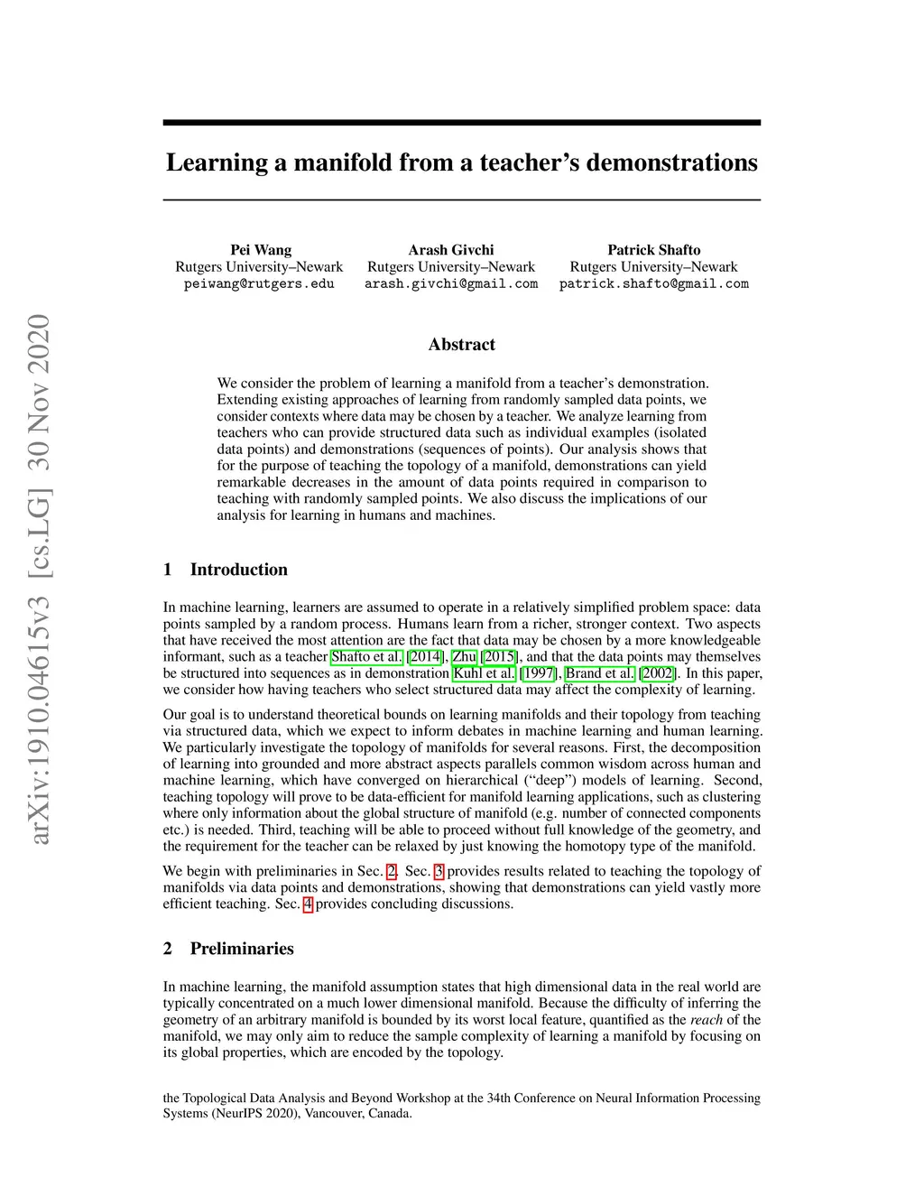 We consider the problem of learning a manifold from a teacher's demonstration. Extending existing approaches of learning from randomly sampled data points, we consider contexts where data may be chosen by a teacher. We analyze learning from teachers who can provide structured data such as individual examples (isolated data points) and demonstrations (sequences of points). Our analysis shows that for the purpose of teaching the topology of a manifold, demonstrations can yield remarkable decreases in the amount of data points required in comparison to teaching with randomly sampled points. We also discuss the implications of our analysis for learning in humans and machines.