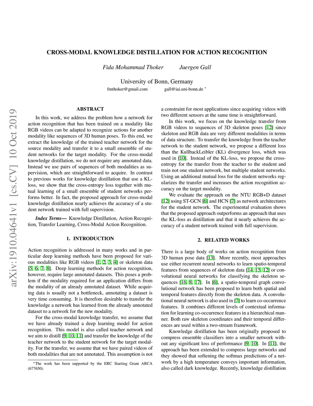 In this work, we address the problem how a network for action recognition that has been trained on a modality like RGB videos can be adapted to recognize actions for another modality like sequences of 3D human poses. To this end, we extract the knowledge of the trained teacher network for the source modality and transfer it to a small ensemble of student networks for the target modality. For the cross-modal knowledge distillation, we do not require any annotated data. Instead we use pairs of sequences of both modalities as supervision, which are straightforward to acquire. In contrast to previous works for knowledge distillation that use a KL-loss, we show that the cross-entropy loss together with mutual learning of a small ensemble of student networks performs better. In fact, the proposed approach for cross-modal knowledge distillation nearly achieves the accuracy of a student network trained with full supervision.