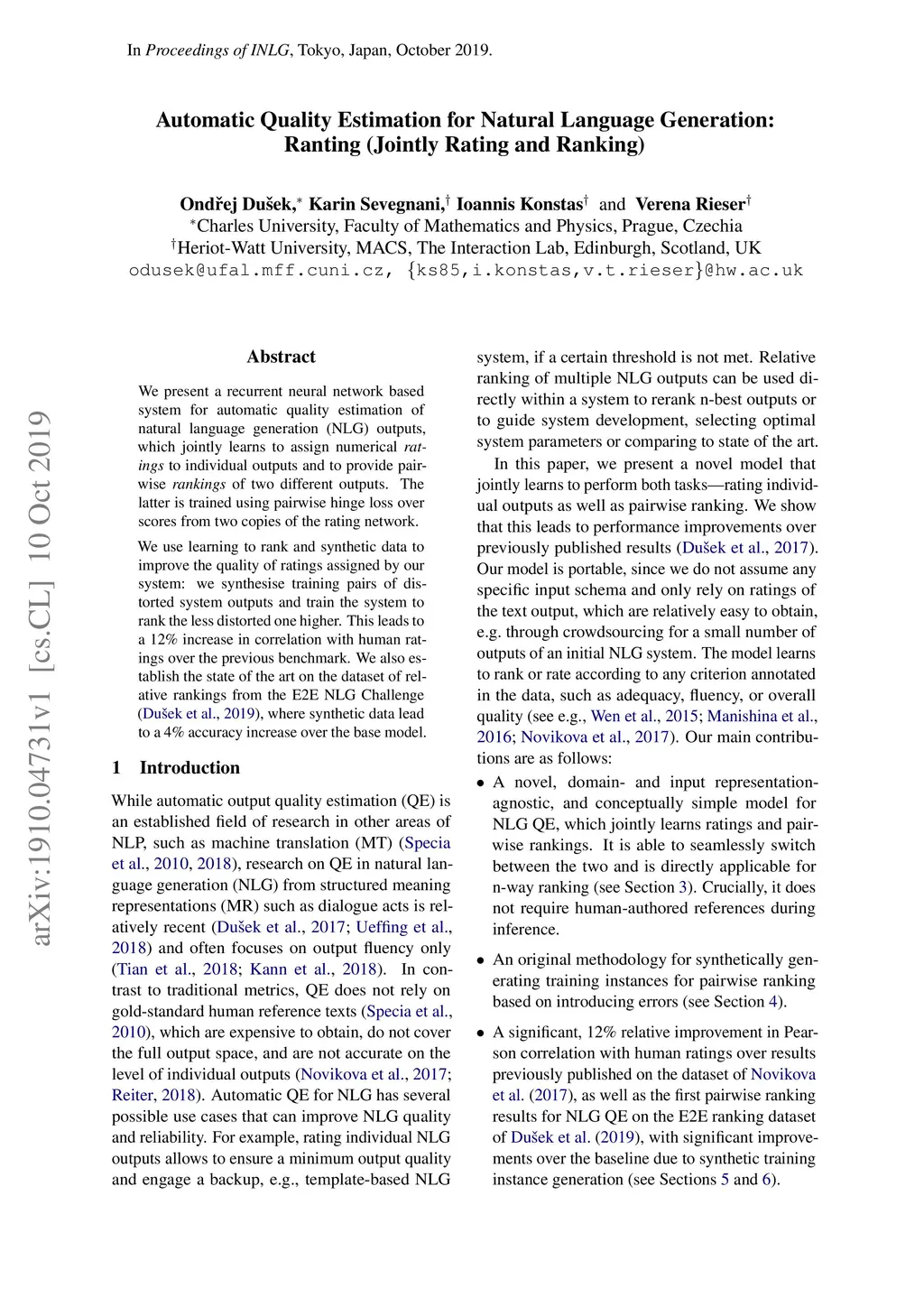 We present a recurrent neural network based system for automatic quality estimation of natural language generation (NLG) outputs, which jointly learns to assign numerical ratings to individual outputs and to provide pairwise rankings of two different outputs. The latter is trained using pairwise hinge loss over scores from two copies of the rating network. We use learning to rank and synthetic data to improve the quality of ratings assigned by our system: we synthesise training pairs of distorted system outputs and train the system to rank the less distorted one higher. This leads to a 12% increase in correlation with human ratings over the previous benchmark. We also establish the state of the art on the dataset of relative rankings from the E2E NLG Challenge (Du\v{s}ek et al., 2019), where synthetic data lead to a 4% accuracy increase over the base model.