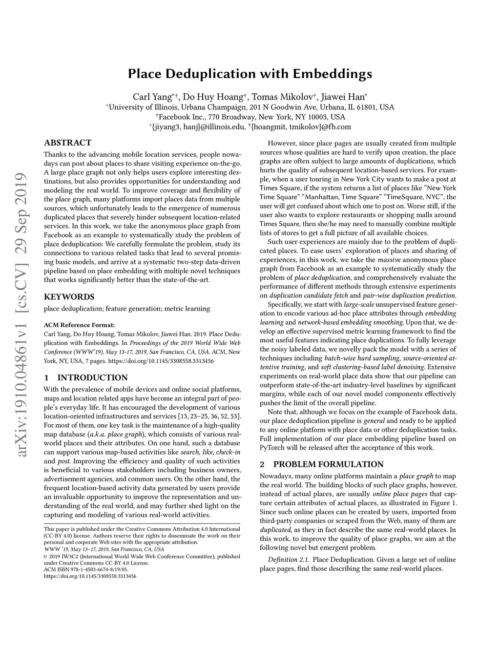 Thanks to the advancing mobile location services, people nowadays can post about places to share visiting experience on-the-go. A large place graph not only helps users explore interesting destinations, but also provides opportunities for understanding and modeling the real world. To improve coverage and flexibility of the place graph, many platforms import places data from multiple sources, which unfortunately leads to the emergence of numerous duplicated places that severely hinder subsequent location-related services. In this work, we take the anonymous place graph from Facebook as an example to systematically study the problem of place deduplication: We carefully formulate the problem, study its connections to various related tasks that lead to several promising basic models, and arrive at a systematic two-step data-driven pipeline based on place embedding with multiple novel techniques that works significantly better than the state-of-the-art.