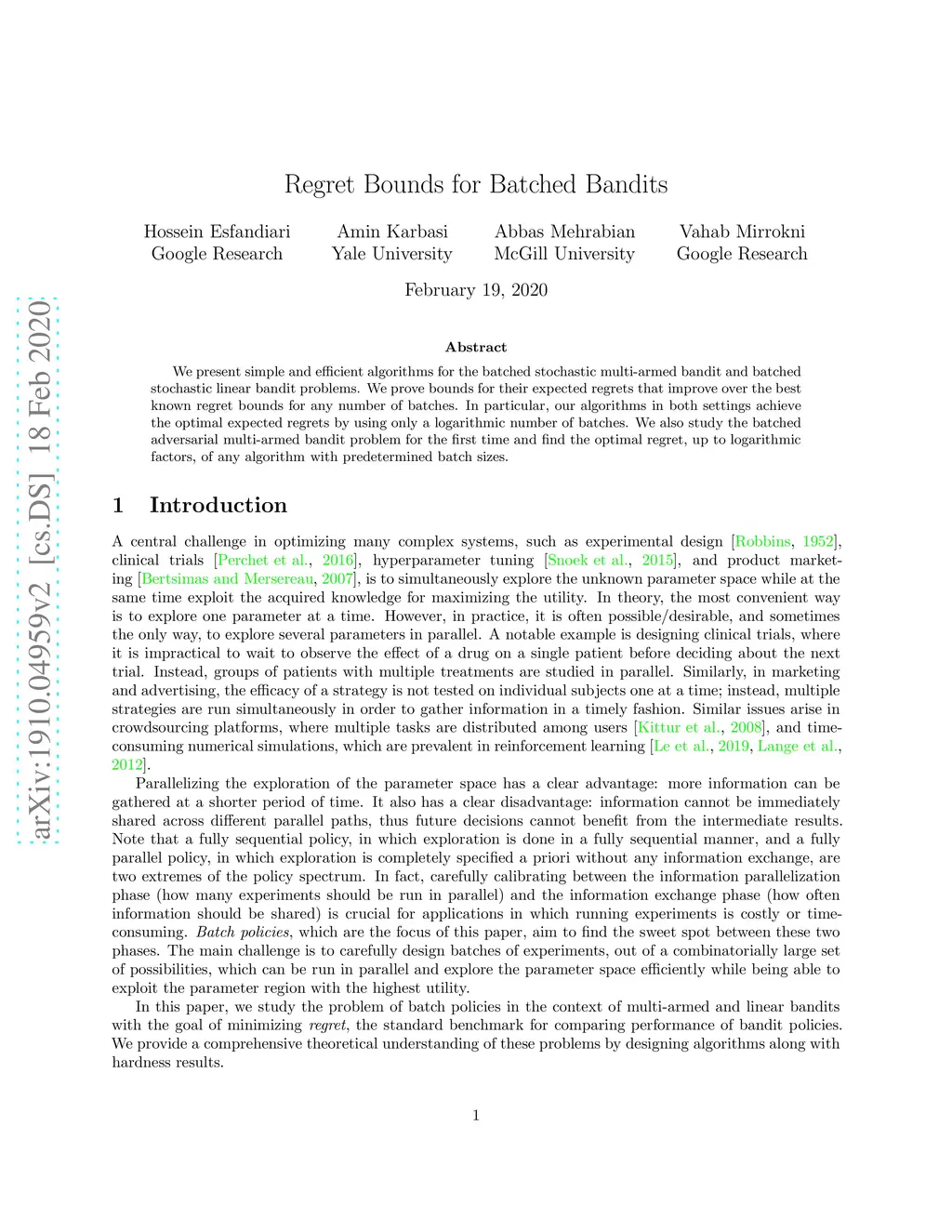 We present simple and efficient algorithms for the batched stochastic multi-armed bandit and batched stochastic linear bandit problems. We prove bounds for their expected regrets that improve over the best-known regret bounds for any number of batches. In particular, our algorithms in both settings achieve the optimal expected regrets by using only a logarithmic number of batches. We also study the batched adversarial multi-armed bandit problem for the first time and find the optimal regret, up to logarithmic factors, of any algorithm with predetermined batch sizes.