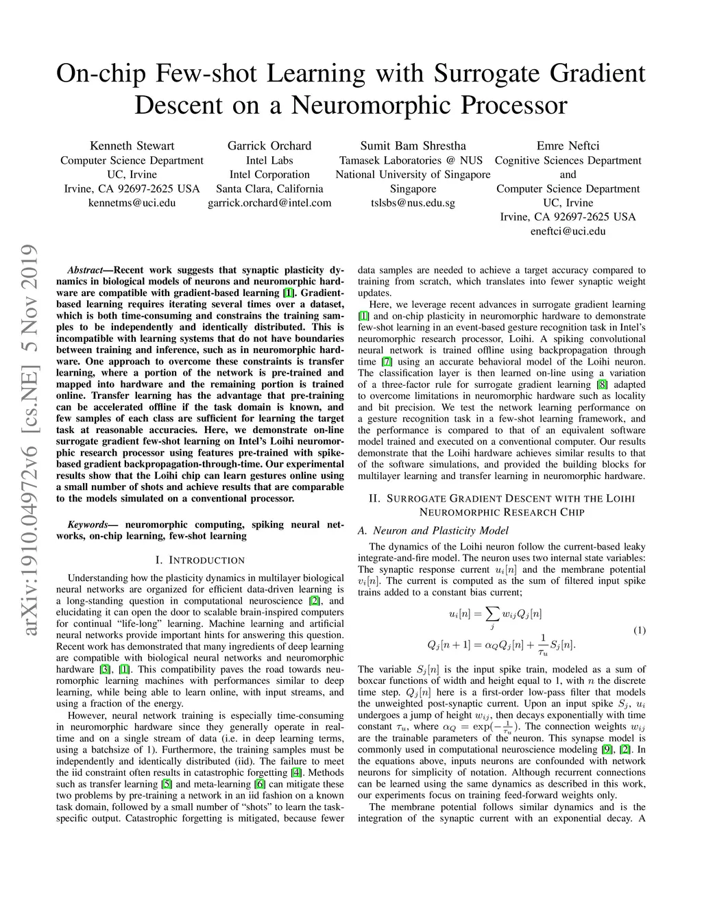 Recent work suggests that synaptic plasticity dynamics in biological models of neurons and neuromorphic hardware are compatible with gradient-based learning (Neftci et al., 2019). Gradient-based learning requires iterating several times over a dataset, which is both time-consuming and constrains the training samples to be independently and identically distributed. This is incompatible with learning systems that do not have boundaries between training and inference, such as in neuromorphic hardware. One approach to overcome these constraints is transfer learning, where a portion of the network is pre-trained and mapped into hardware and the remaining portion is trained online. Transfer learning has the advantage that pre-training can be accelerated offline if the task domain is known, and few samples of each class are sufficient for learning the target task at reasonable accuracies. Here, we demonstrate on-line surrogate gradient few-shot learning on Intel's Loihi neuromorphic research processor using features pre-trained with spike-based gradient backpropagation-through-time. Our experimental results show that the Loihi chip can learn gestures online using a small number of shots and achieve results that are comparable to the models simulated on a conventional processor.