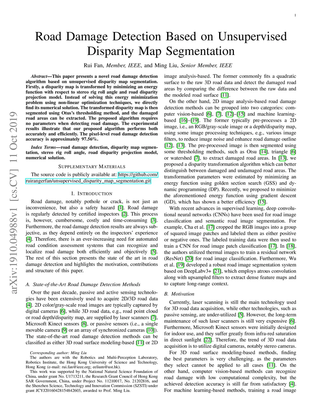 Road Damage Detection Based on Unsupervised Disparity Map Segmentation