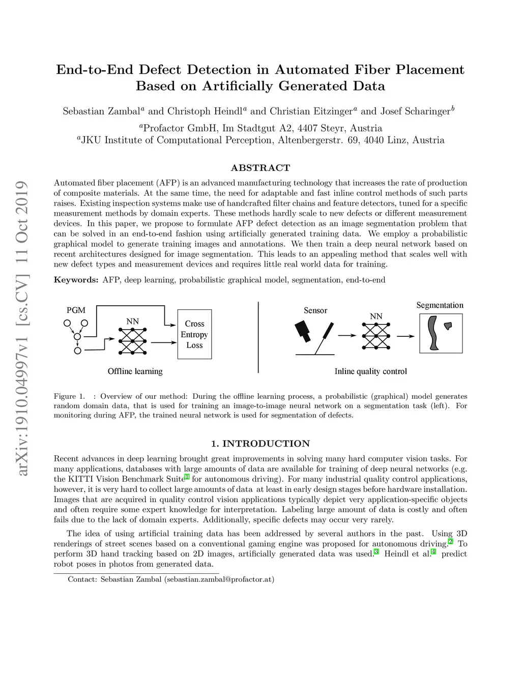 Automated fiber placement (AFP) is an advanced manufacturing technology that increases the rate of production of composite materials. At the same time, the need for adaptable and fast inline control methods of such parts raises. Existing inspection systems make use of handcrafted filter chains and feature detectors, tuned for a specific measurement methods by domain experts. These methods hardly scale to new defects or different measurement devices. In this paper, we propose to formulate AFP defect detection as an image segmentation problem that can be solved in an end-to-end fashion using artificially generated training data. We employ a probabilistic graphical model to generate training images and annotations. We then train a deep neural network based on recent architectures designed for image segmentation. This leads to an appealing method that scales well with new defect types and measurement devices and requires little real world data for training.