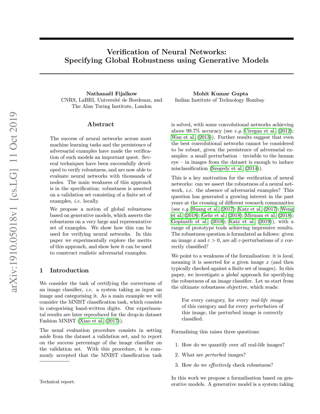 The success of neural networks across most machine learning tasks and the persistence of adversarial examples have made the verification of such models an important quest. Several techniques have been successfully developed to verify robustness, and are now able to evaluate neural networks with thousands of nodes. The main weakness of this approach is in the specification: robustness is asserted on a validation set consisting of a finite set of examples, i.e. locally. We propose a notion of global robustness based on generative models, which asserts the robustness on a very large and representative set of examples. We show how this can be used for verifying neural networks. In this paper we experimentally explore the merits of this approach, and show how it can be used to construct realistic adversarial examples.