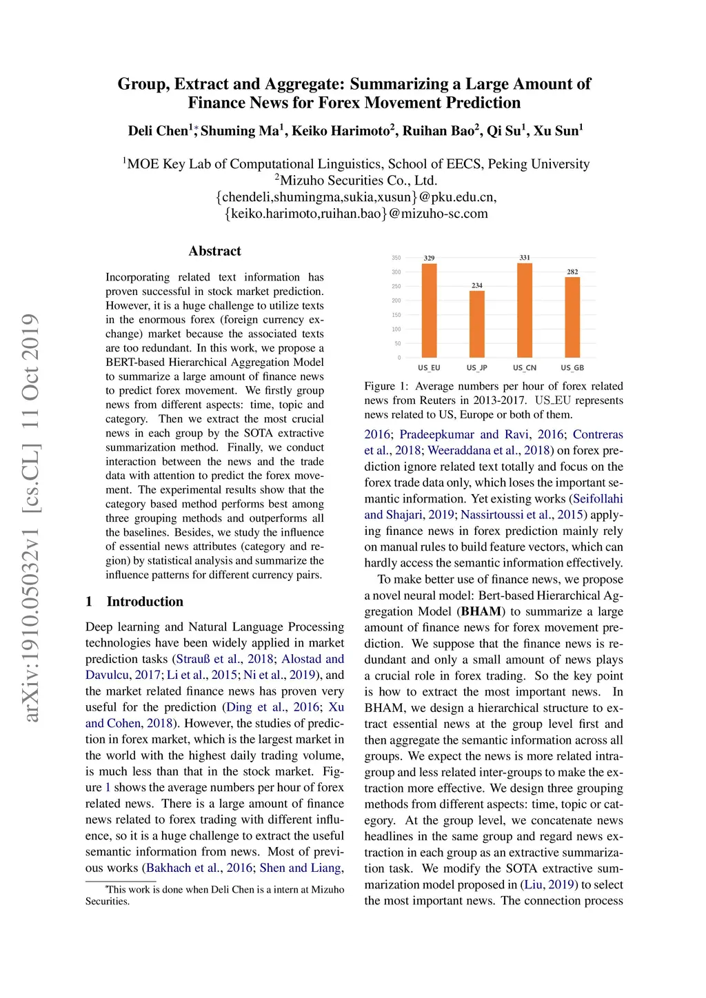 Incorporating related text information has proven successful in stock market prediction. However, it is a huge challenge to utilize texts in the enormous forex (foreign currency exchange) market because the associated texts are too redundant. In this work, we propose a BERT-based Hierarchical Aggregation Model to summarize a large amount of finance news to predict forex movement. We firstly group news from different aspects: time, topic and category. Then we extract the most crucial news in each group by the SOTA extractive summarization method. Finally, we conduct interaction between the news and the trade data with attention to predict the forex movement. The experimental results show that the category based method performs best among three grouping methods and outperforms all the baselines. Besides, we study the influence of essential news attributes (category and region) by statistical analysis and summarize the influence patterns for different currency pairs.