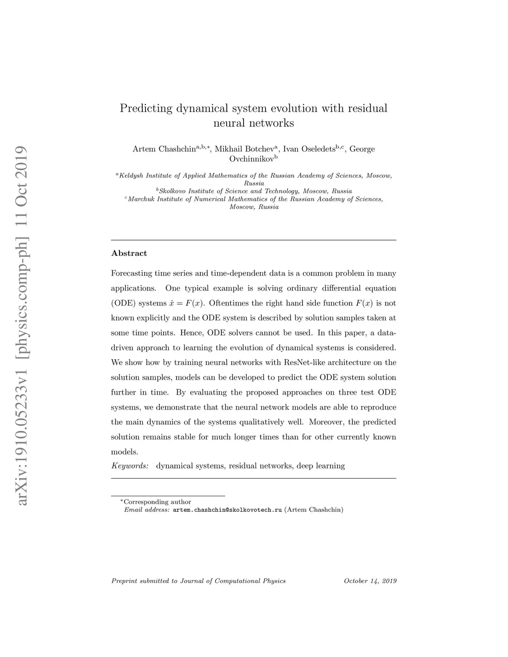 Forecasting time series and time-dependent data is a common problem in many applications. One typical example is solving ordinary differential equation (ODE) systems . Oftentimes the right hand side function is not known explicitly and the ODE system is described by solution samples taken at some time points. Hence, ODE solvers cannot be used. In this paper, a data-driven approach to learning the evolution of dynamical systems is considered. We show how by training neural networks with ResNet-like architecture on the solution samples, models can be developed to predict the ODE system solution further in time. By evaluating the proposed approaches on three test ODE systems, we demonstrate that the neural network models are able to reproduce the main dynamics of the systems qualitatively well. Moreover, the predicted solution remains stable for much longer times than for other currently known models.