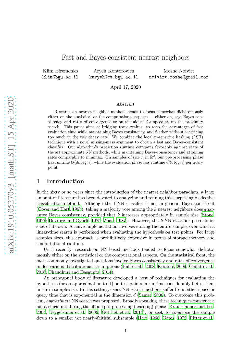 Research on nearest-neighbor methods tends to focus somewhat dichotomously either on the statistical or the computational aspects -- either on, say, Bayes consistency and rates of convergence or on techniques for speeding up the proximity search. This paper aims at bridging these realms: to reap the advantages of fast evaluation time while maintaining Bayes consistency, and further without sacrificing too much in the risk decay rate. We combine the locality-sensitive hashing (LSH) technique with a novel missing-mass argument to obtain a fast and Bayes-consistent classifier. Our algorithm's prediction runtime compares favorably against state of the art approximate NN methods, while maintaining Bayes-consistency and attaining rates comparable to minimax. On samples of size in , our pre-processing phase has runtime , while the evaluation phase has runtime per query point.