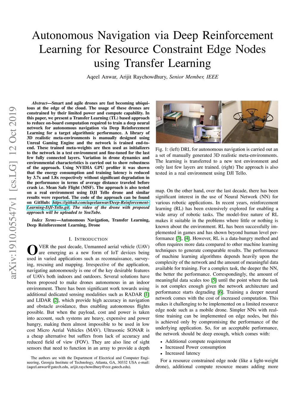 Smart and agile drones are fast becoming ubiquitous at the edge of the cloud. The usage of these drones are constrained by their limited power and compute capability. In this paper, we present a Transfer Learning (TL) based approach to reduce on-board computation required to train a deep neural network for autonomous navigation via Deep Reinforcement Learning for a target algorithmic performance. A library of 3D realistic meta-environments is manually designed using Unreal Gaming Engine and the network is trained end-to-end. These trained meta-weights are then used as initializers to the network in a test environment and fine-tuned for the last few fully connected layers. Variation in drone dynamics and environmental characteristics is carried out to show robustness of the approach. Using NVIDIA GPU profiler it was shown that the energy consumption and training latency is reduced by 3.7x and 1.8x respectively without significant degradation in the performance in terms of average distance traveled before crash i.e. Mean Safe Flight (MSF). The approach is also tested on a real environment using DJI Tello drone and similar results were reported.