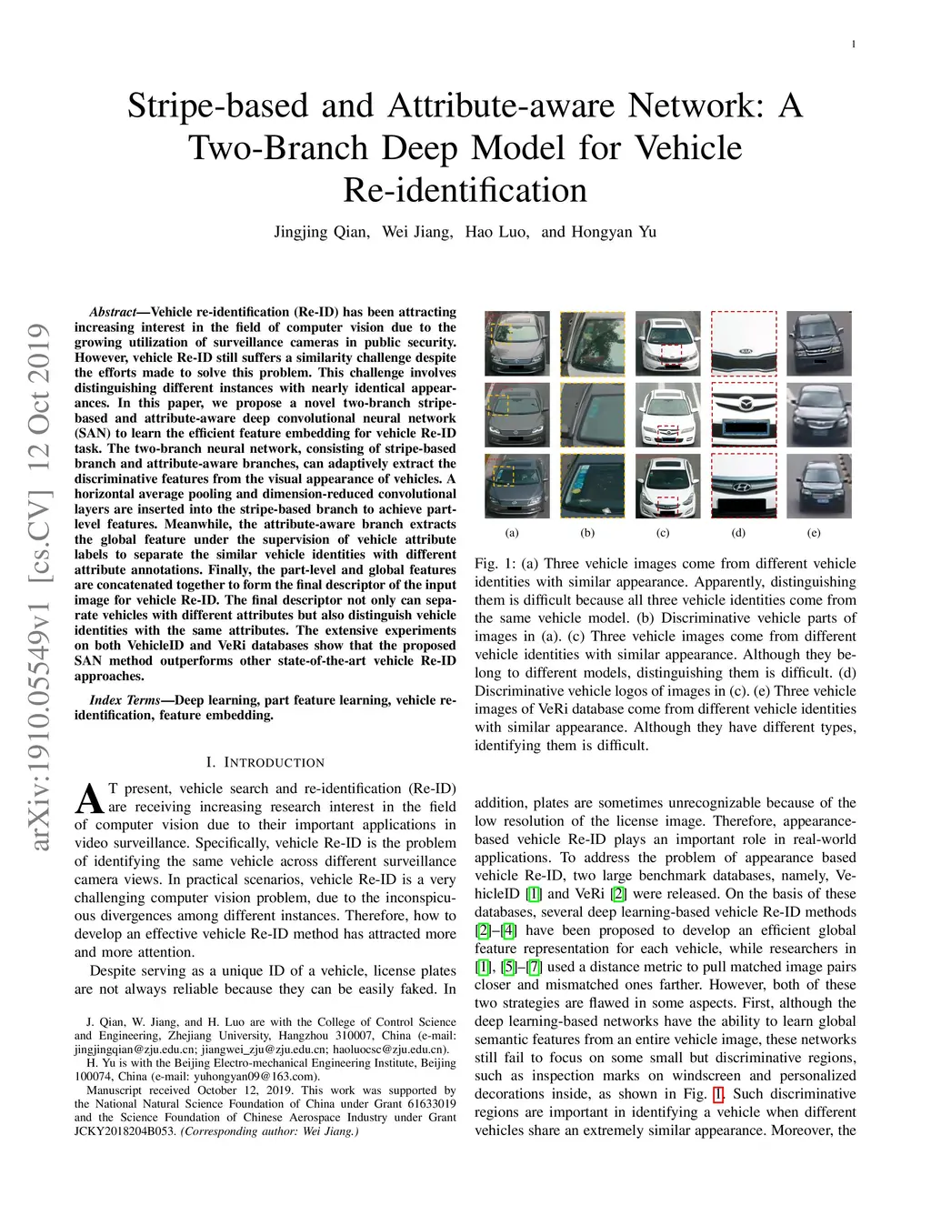 Vehicle re-identification (Re-ID) has been attracting increasing interest in the field of computer vision due to the growing utilization of surveillance cameras in public security. However, vehicle Re-ID still suffers a similarity challenge despite the efforts made to solve this problem. This challenge involves distinguishing different instances with nearly identical appearances. In this paper, we propose a novel two-branch stripe-based and attribute-aware deep convolutional neural network (SAN) to learn the efficient feature embedding for vehicle Re-ID task. The two-branch neural network, consisting of stripe-based branch and attribute-aware branches, can adaptively extract the discriminative features from the visual appearance of vehicles. A horizontal average pooling and dimension-reduced convolutional layers are inserted into the stripe-based branch to achieve part-level features. Meanwhile, the attribute-aware branch extracts the global feature under the supervision of vehicle attribute labels to separate the similar vehicle identities with different attribute annotations. Finally, the part-level and global features are concatenated together to form the final descriptor of the input image for vehicle Re-ID. The final descriptor not only can separate vehicles with different attributes but also distinguish vehicle identities with the same attributes. The extensive experiments on both VehicleID and VeRi databases show that the proposed SAN method outperforms other state-of-the-art vehicle Re-ID approaches.