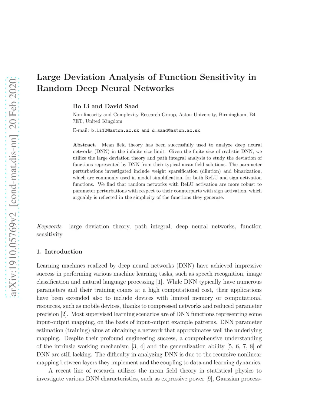 Mean field theory has been successfully used to analyze deep neural networks (DNN) in the infinite size limit. Given the finite size of realistic DNN, we utilize the large deviation theory and path integral analysis to study the deviation of functions represented by DNN from their typical mean field solutions. The parameter perturbations investigated include weight sparsification (dilution) and binarization, which are commonly used in model simplification, for both ReLU and sign activation functions. We find that random networks with ReLU activation are more robust to parameter perturbations with respect to their counterparts with sign activation, which arguably is reflected in the simplicity of the functions they generate.