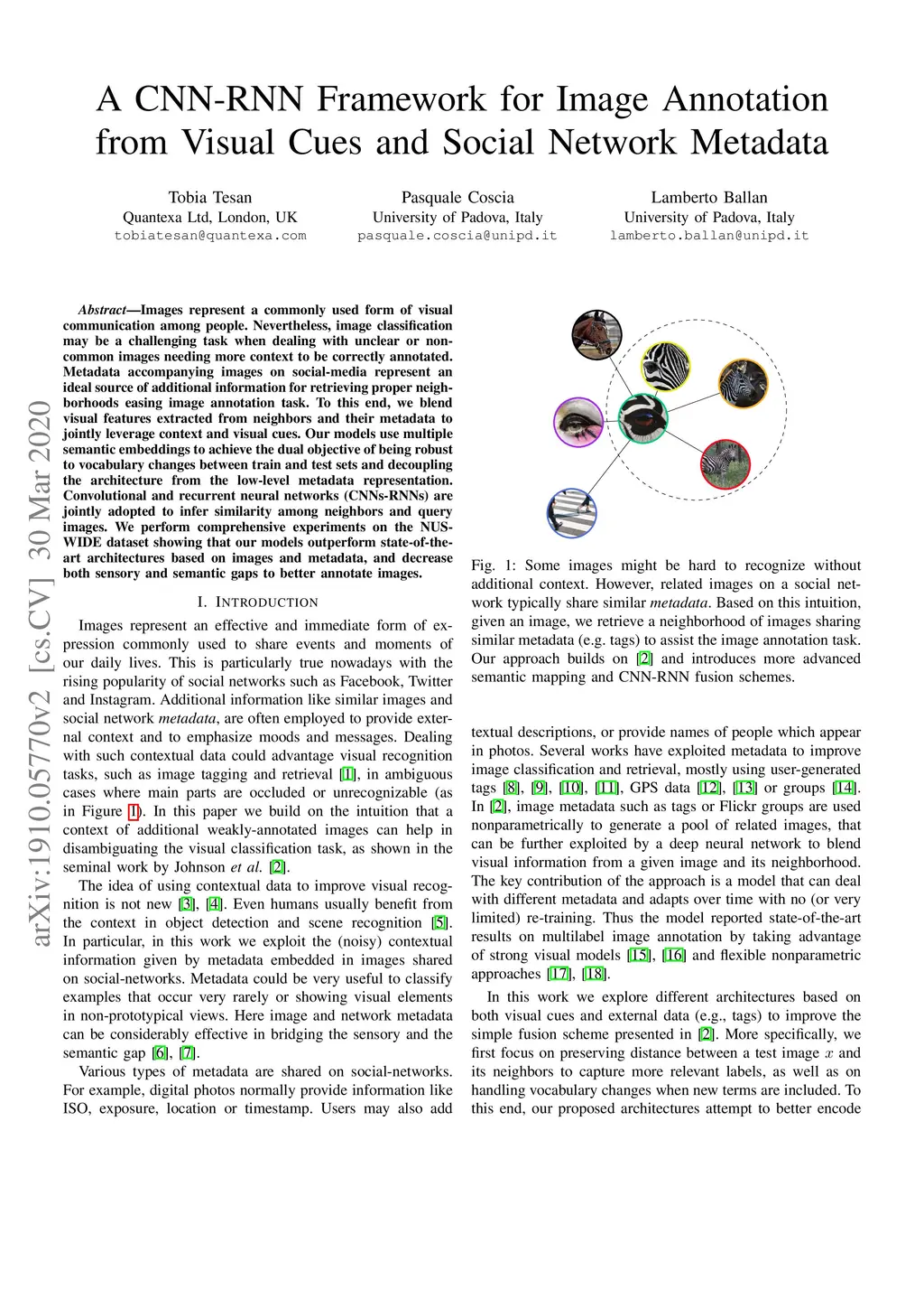 Images represent a commonly used form of visual communication among people. Nevertheless, image classification may be a challenging task when dealing with unclear or non-common images needing more context to be correctly annotated. Metadata accompanying images on social-media represent an ideal source of additional information for retrieving proper neighborhoods easing image annotation task. To this end, we blend visual features extracted from neighbors and their metadata to jointly leverage context and visual cues. Our models use multiple semantic embeddings to achieve the dual objective of being robust to vocabulary changes between train and test sets and decoupling the architecture from the low-level metadata representation. Convolutional and recurrent neural networks (CNNs-RNNs) are jointly adopted to infer similarity among neighbors and query images. We perform comprehensive experiments on the NUS-WIDE dataset showing that our models outperform state-of-the-art architectures based on images and metadata, and decrease both sensory and semantic gaps to better annotate images.