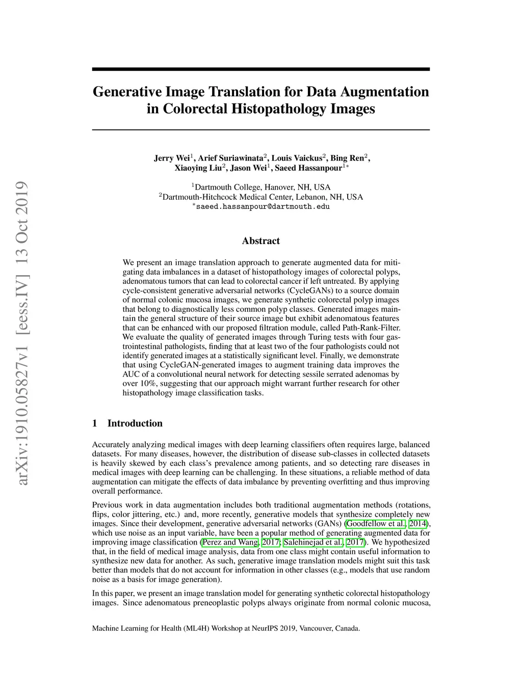 We present an image translation approach to generate augmented data for mitigating data imbalances in a dataset of histopathology images of colorectal polyps, adenomatous tumors that can lead to colorectal cancer if left untreated. By applying cycle-consistent generative adversarial networks (CycleGANs) to a source domain of normal colonic mucosa images, we generate synthetic colorectal polyp images that belong to diagnostically less common polyp classes. Generated images maintain the general structure of their source image but exhibit adenomatous features that can be enhanced with our proposed filtration module, called Path-Rank-Filter. We evaluate the quality of generated images through Turing tests with four gastrointestinal pathologists, finding that at least two of the four pathologists could not identify generated images at a statistically significant level. Finally, we demonstrate that using CycleGAN-generated images to augment training data improves the AUC of a convolutional neural network for detecting sessile serrated adenomas by over 10%, suggesting that our approach might warrant further research for other histopathology image classification tasks.